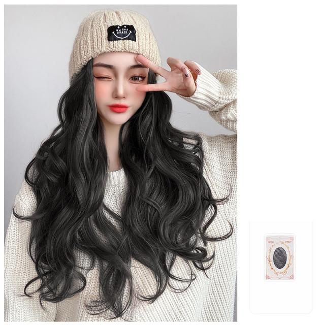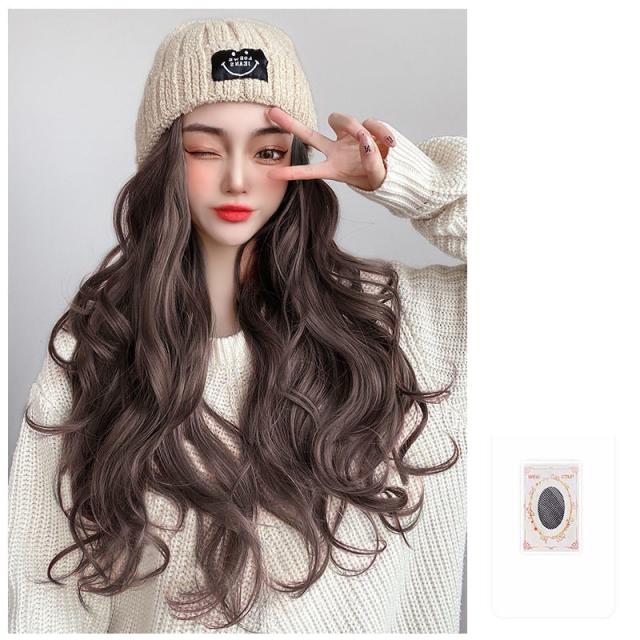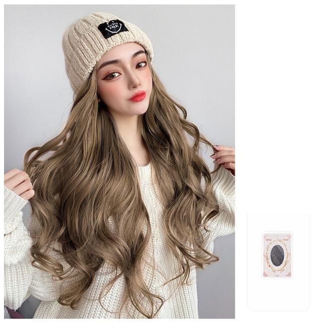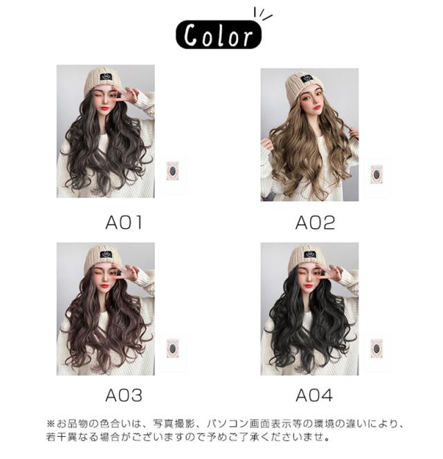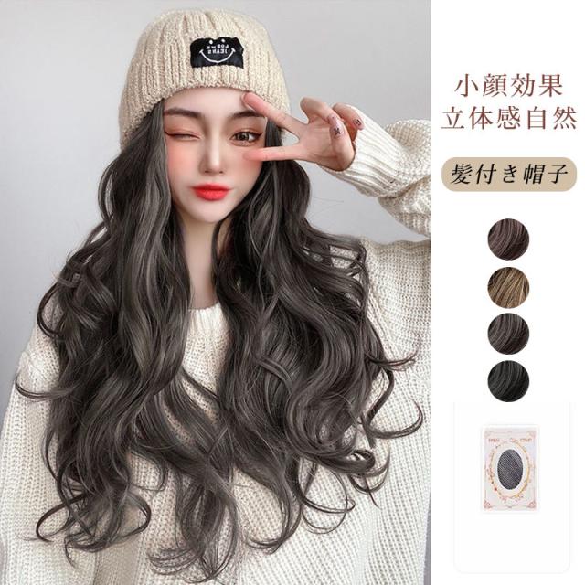 帽子ウィッグ レディース かつら ロング巻き 暖かい つけ毛 エクステ キャップ 髪付き帽子 セミロング 自然パーマ ニット 日常