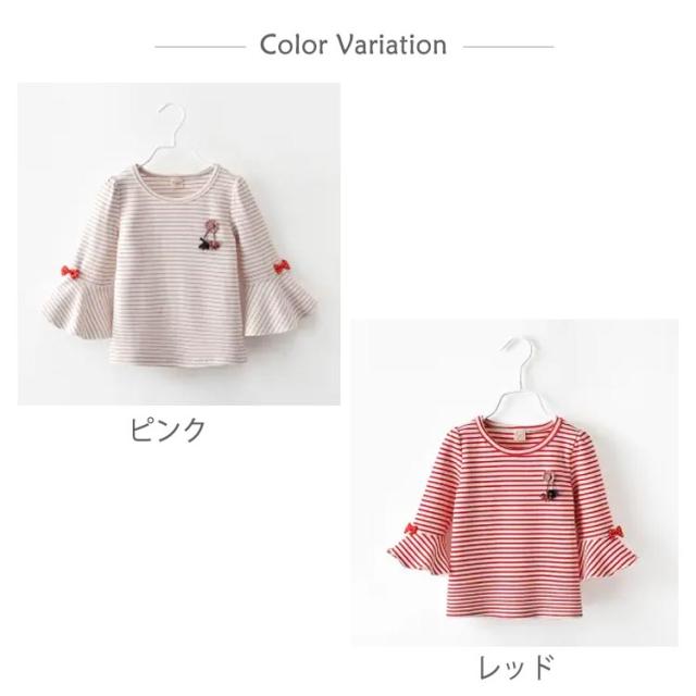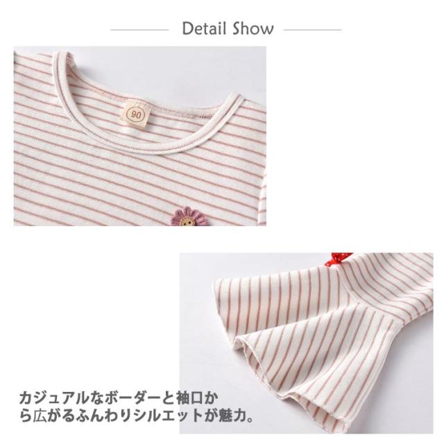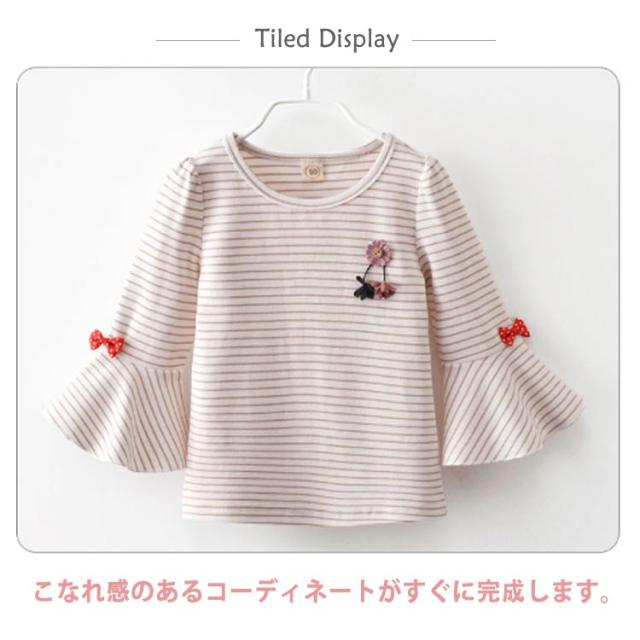 送料無料 ボーダー 長袖 Tシャツ カットソー 袖フレア フラワー 花柄 ボーダー柄 ストレッチ ロンT フレア チュニック インナー ガールズ トップス ブラウス 子供服 通園 通学 シンプル ピンク レッド