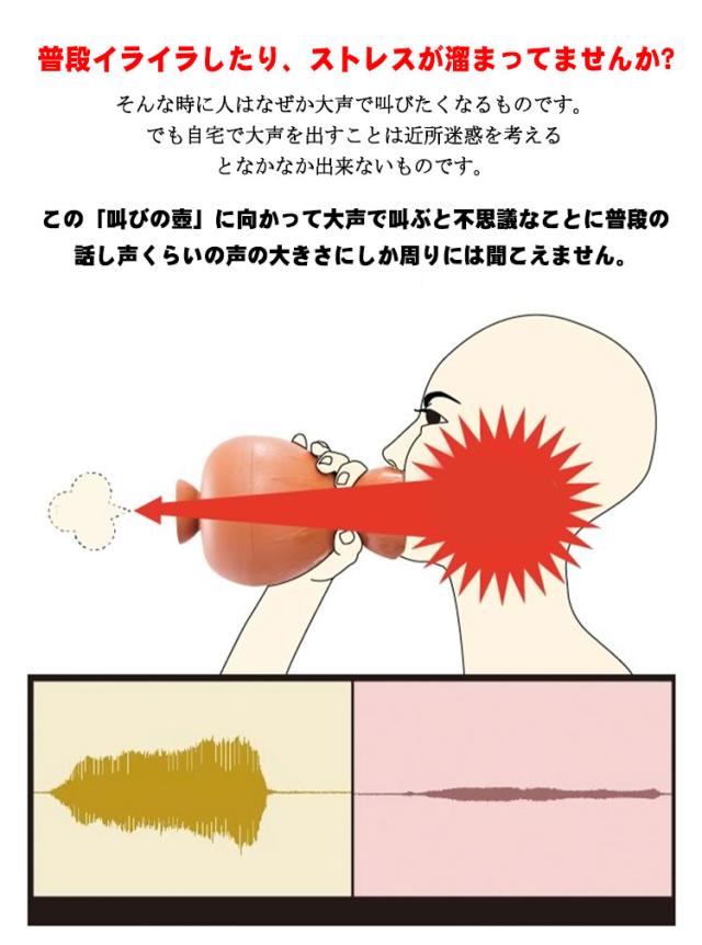 | 壺に向かって大声で叫べ!! 普段イライラしたり、ストレスが溜まってませんか? そんな時に人はなぜか大声で叫びたくなるものです。 でも自宅で大声を出すことは近所迷惑を考えるとなかなか出来ないものです。 この「叫びの壺」に向かって大声で叫ぶと不思議なことに普段の話し声くらいの声の大きさにしか周りには聞こえません。 その仕組みは管楽器の消音機(ミュート)の機能を忠実に壺の中に再現しているからです。 普段使わないときは、インテリアの壺としてもご利用いただけます。 | |