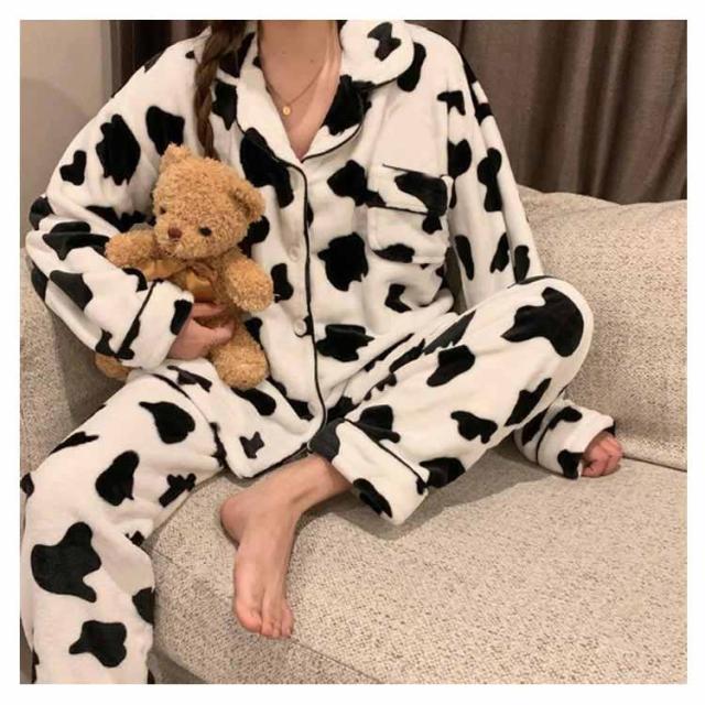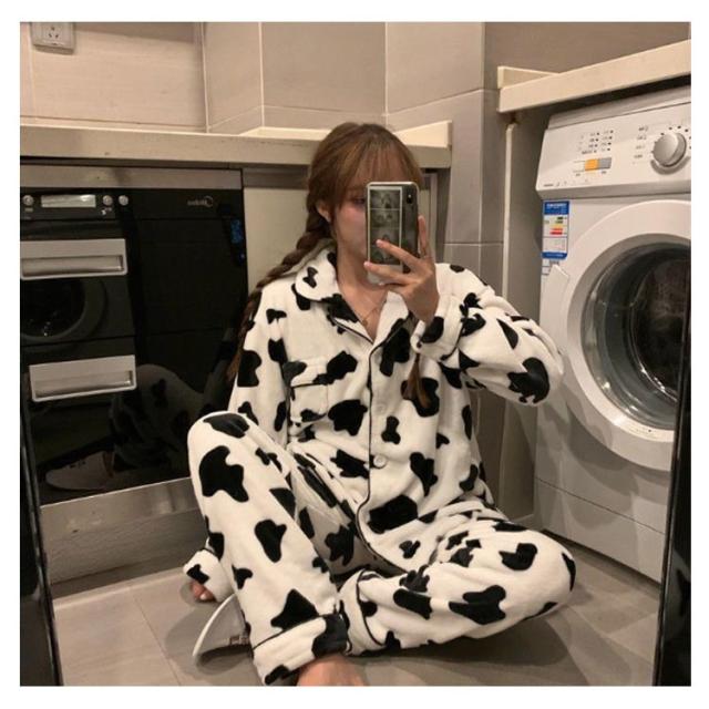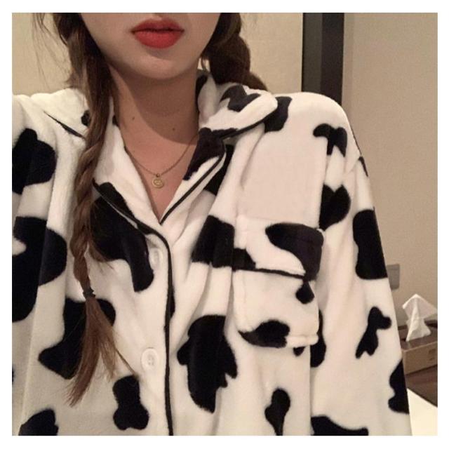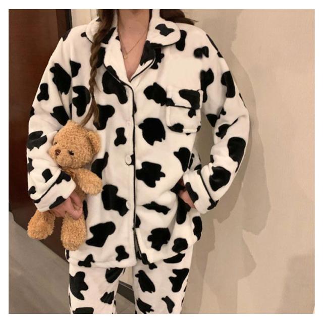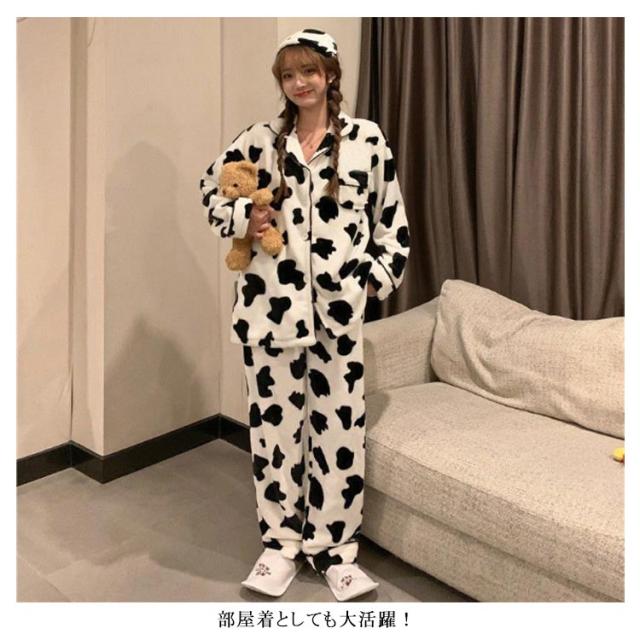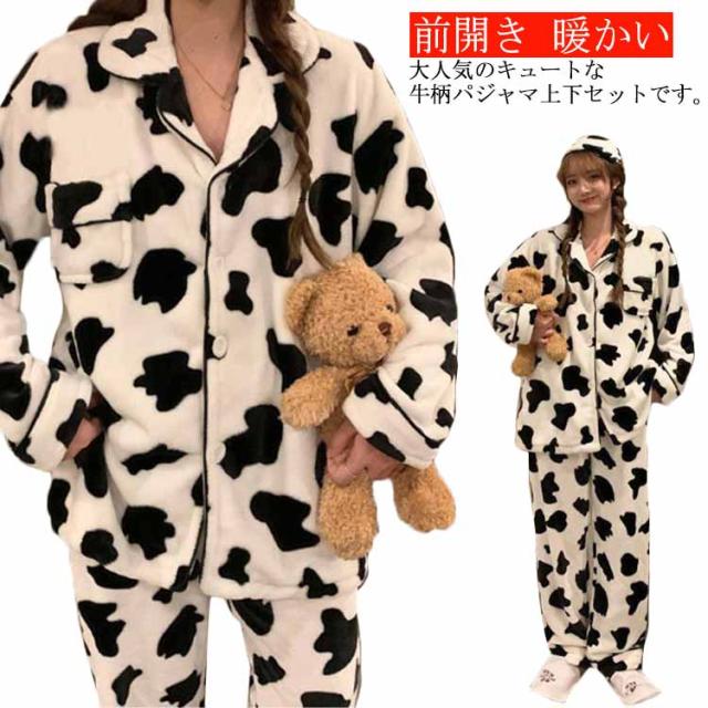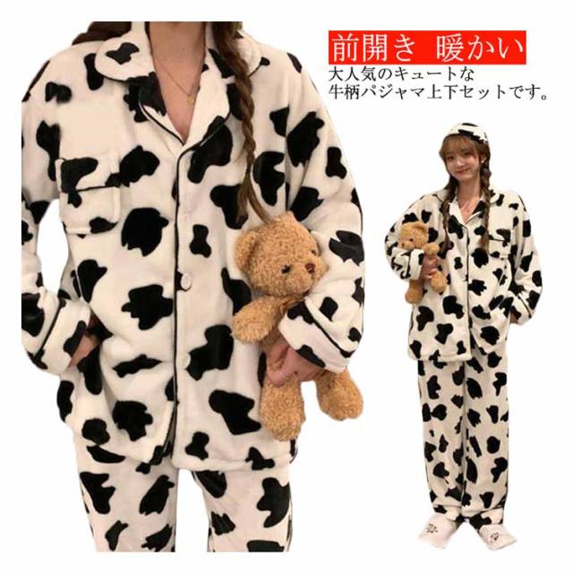 パジャマ 牛柄 ルームウェア レディース 上下セット 起毛 秋冬 前開き 長袖 ロングパンツ もこもこ ふわふわ ナイトウェア かわいい あったか 暖かい 部屋着 修学 旅行 寝巻き 女子会 プレゼント