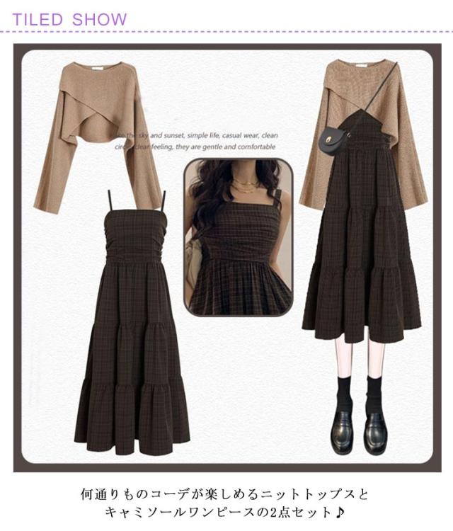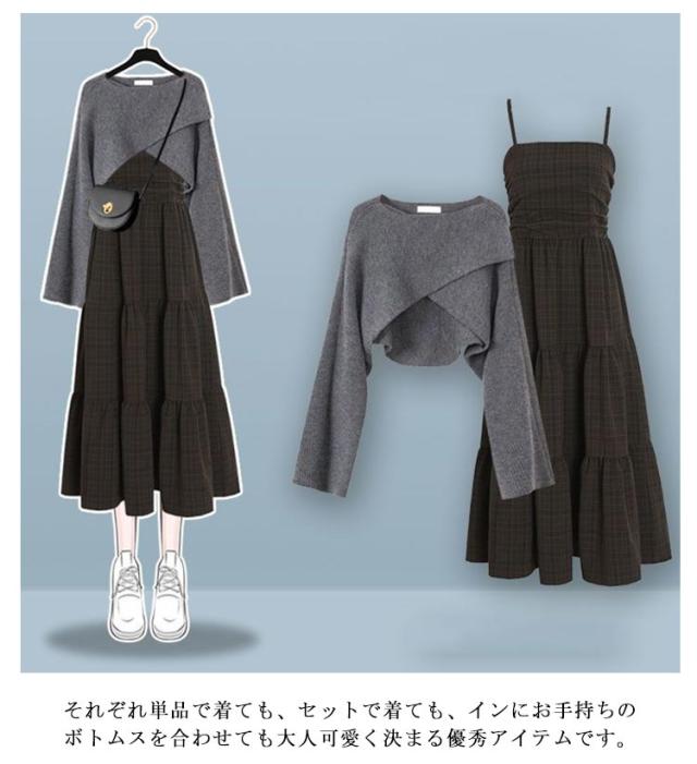 ニット ニットセーター セットアップ レディース 2点セット 長袖 ワンピース クロス ニットトップス フレアワンピース キャミソールワンピース Aライン ロングワンピース ミモレ丈 レイヤード風 重ね着風 大人 通学 通勤 カジュアル オフィス 春秋