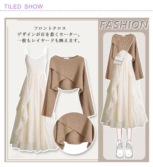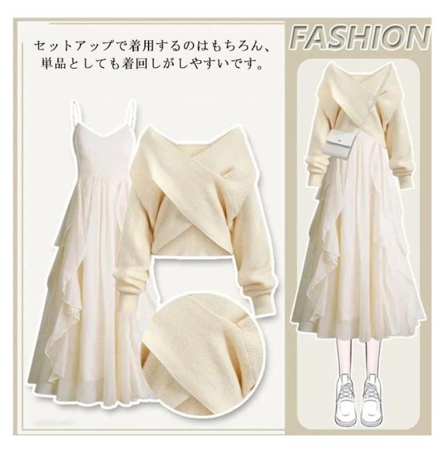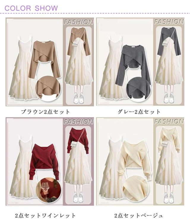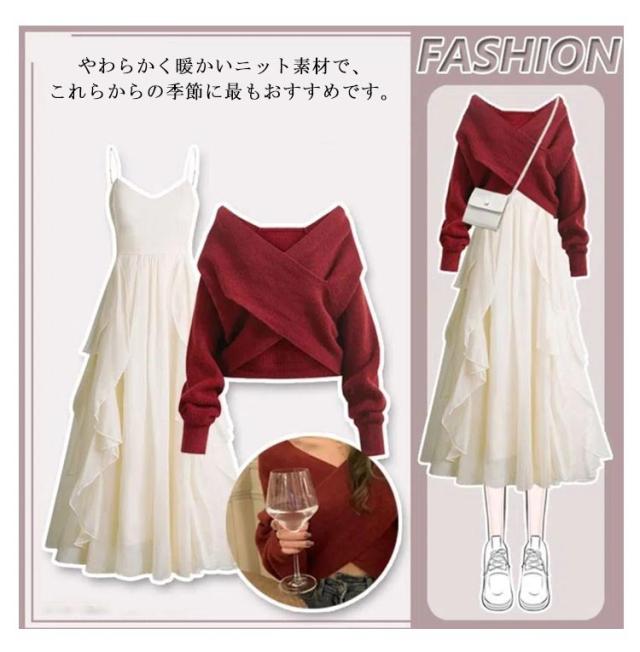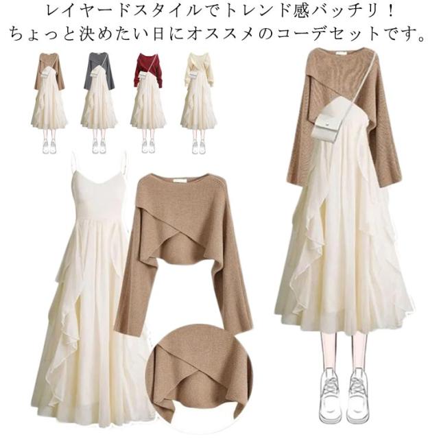 ニット セットアップ レディース ニットセーター 長袖 ワンピース 2点セット クロス ニットトップス フレアロングワンピース 上下セット Aラインワンピース ミモレ丈 レイヤード風 重ね着風 大人 通学 通勤 カジュアル オフィス