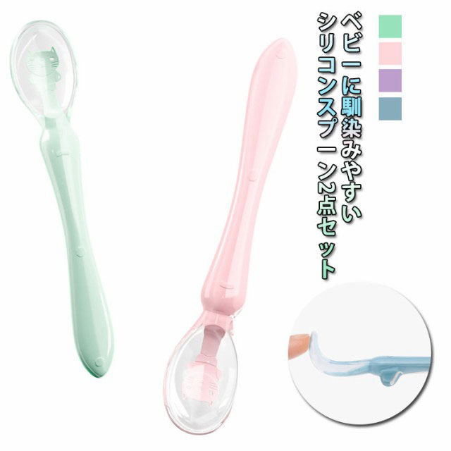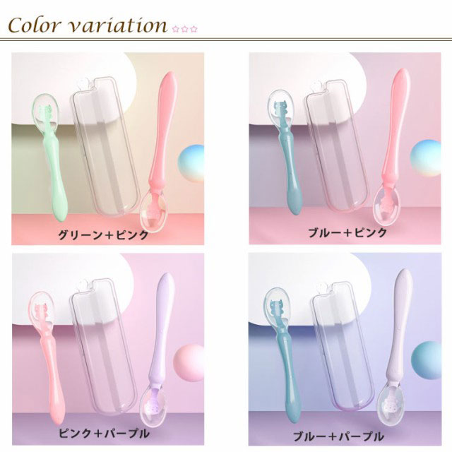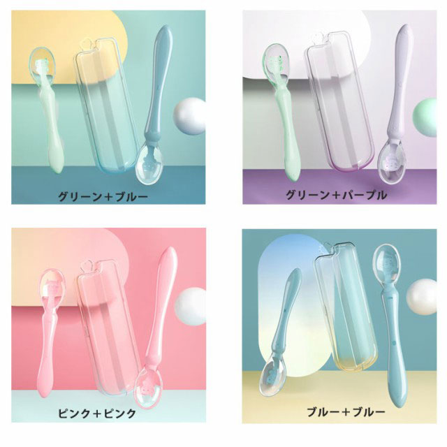 | ベビーに馴染みやすいシリコンスプーン2点セット やわらかいシリコン素材なので、口に入れた時の感触が優しく、しかも先端は丸い安全設計でお口に合う形です。 子供の手に馴染んで持ちやすい、グリップは自分で食べる練習にぴったり。 持ち運びに便利なケース付き、お外で食事する時にも役に立ちます。 | |