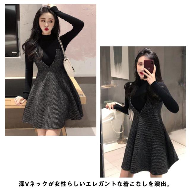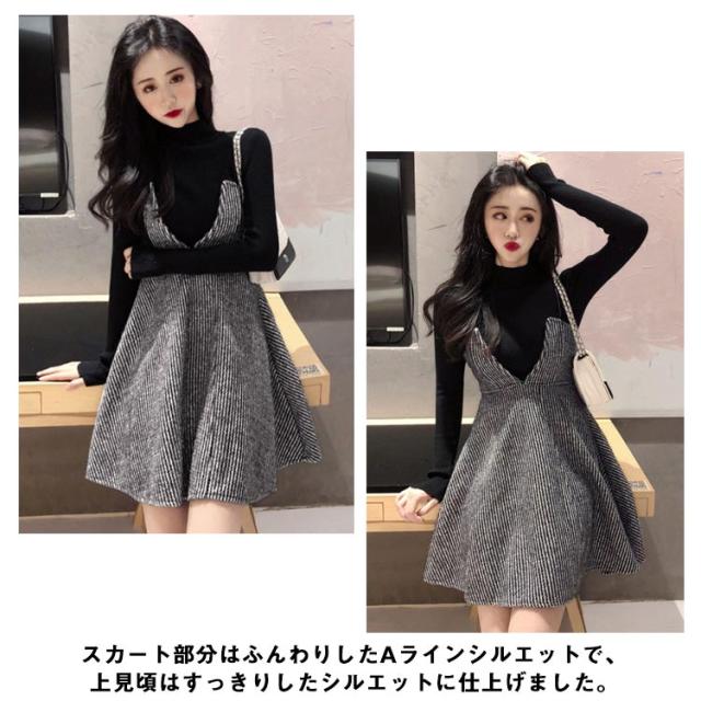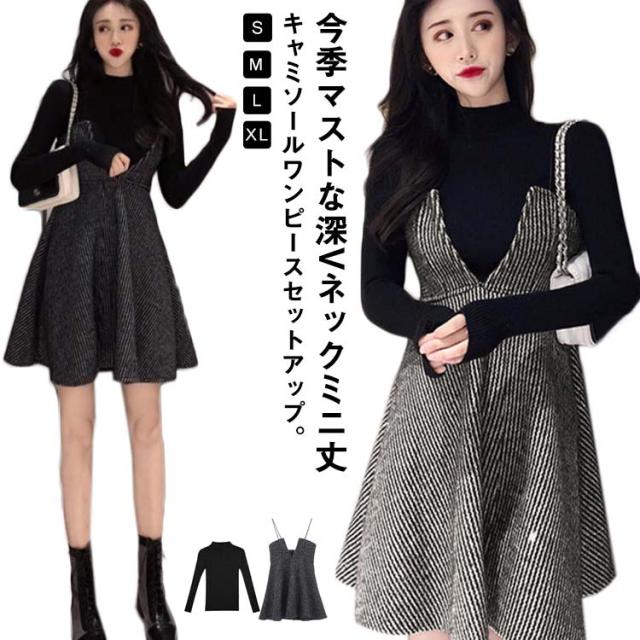 ワンピース セットアップ キャミソール ワンピース 深めVネック レディース Aライン ワンピ ミニ丈 ツイード ブラウス 長袖 メロウ 大人可愛い ミニワンピース ストライプ柄 着痩せ 春秋 通勤 普段着 パーティー お呼ばれ