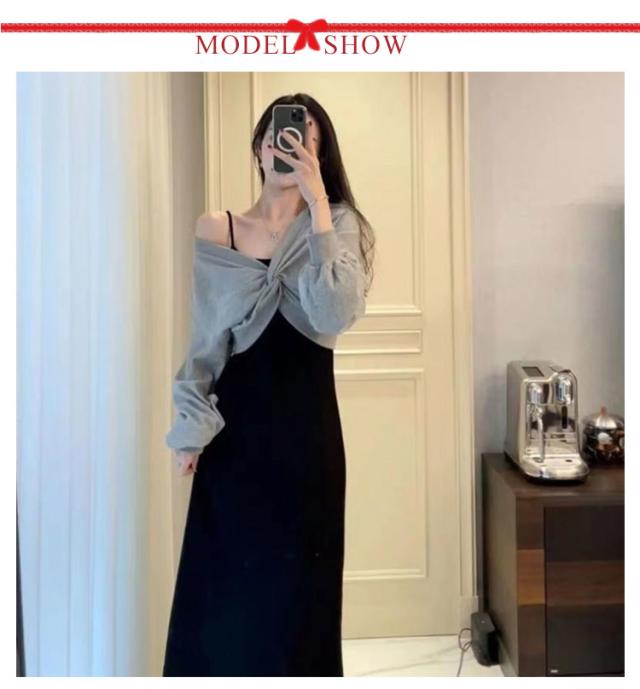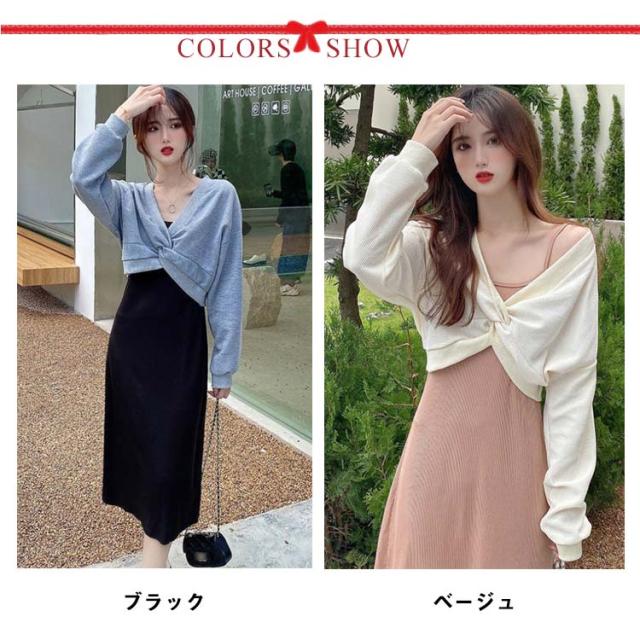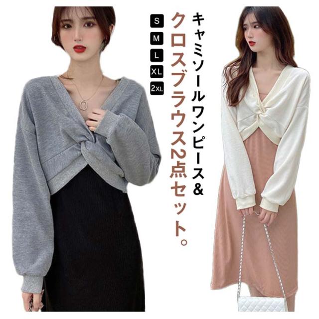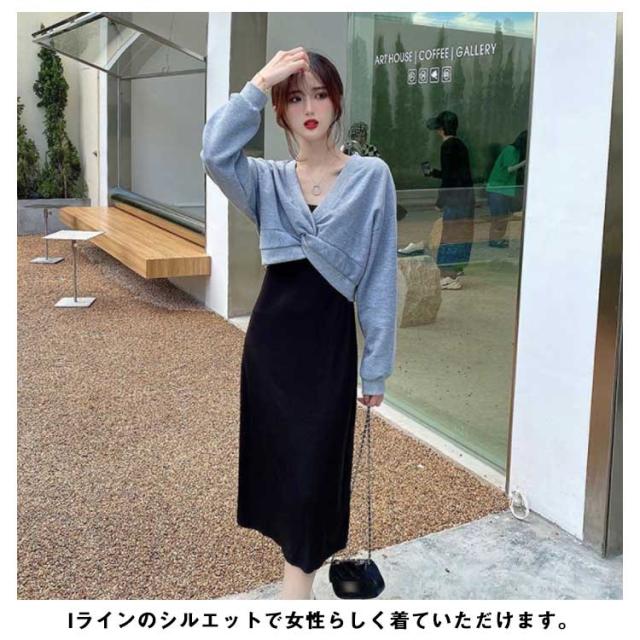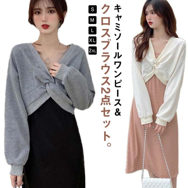キャミソール ワンピース セットアップ レディース 長袖 2点セット クロス ブラウス スウェット トップス 上下セット ストレート ロングワンピース ミモレ丈 レイヤード風 重ね着風 大人 通学 通勤 カジュアル オフィス 春秋 大人可愛い