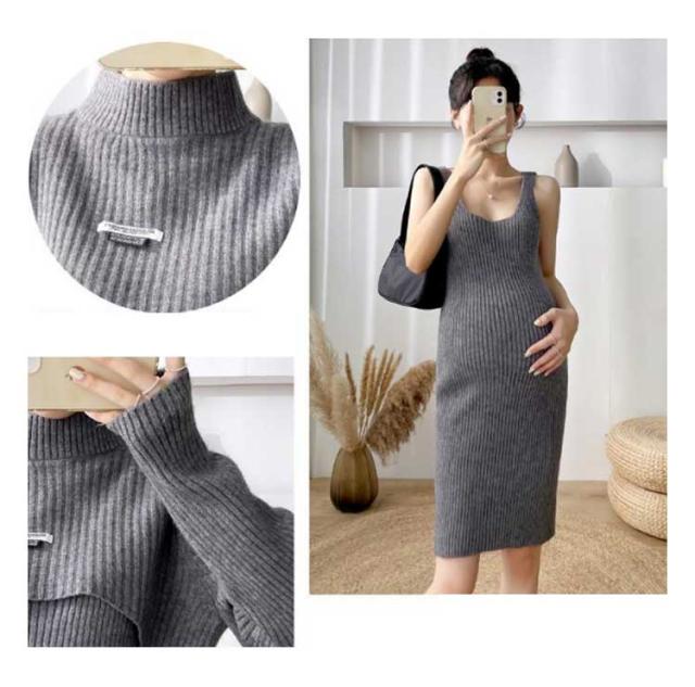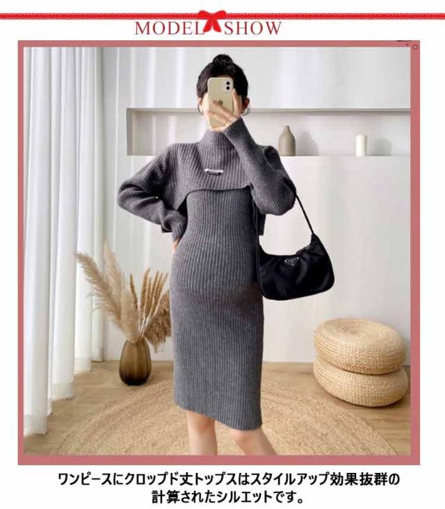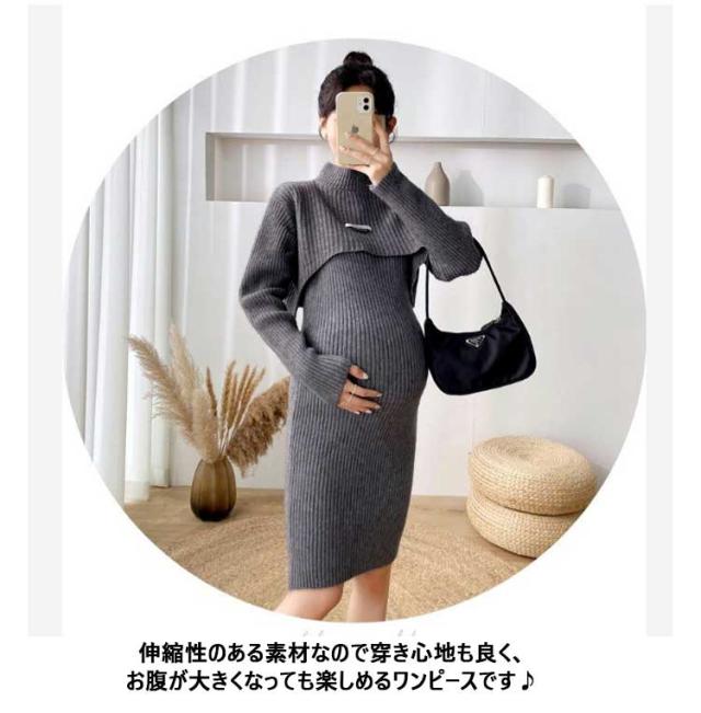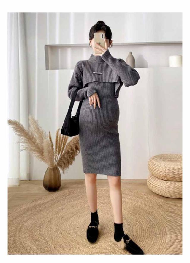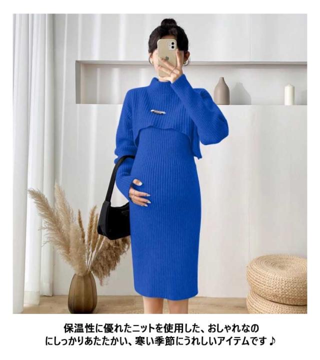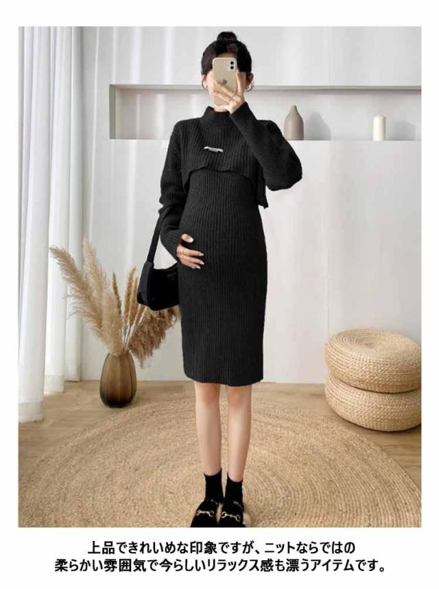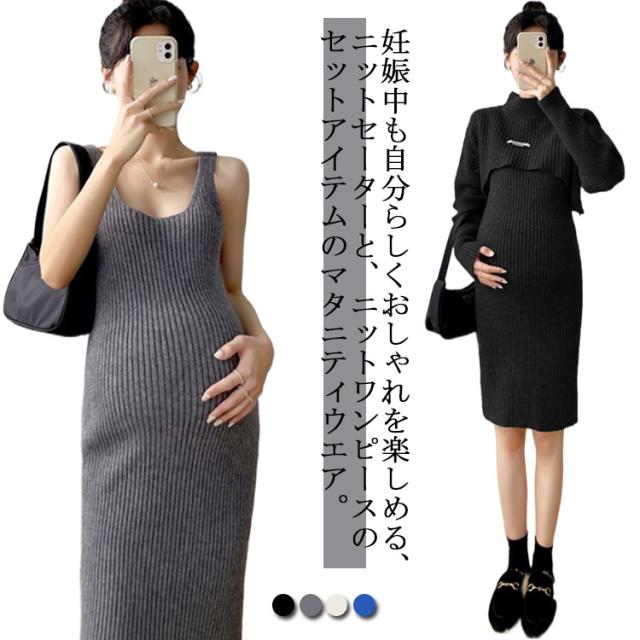 ニット セットアップ マタニティ ニットトップス 長袖 ワンピース 2点セット ニットセーター ハイネック タイトワンピース 膝丈 妊婦服 産前 産後 リブニット プルオーバー レイヤード風 重ね着風 セット 【送料無料】