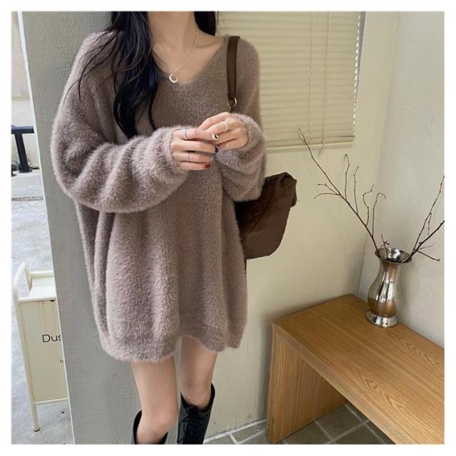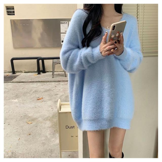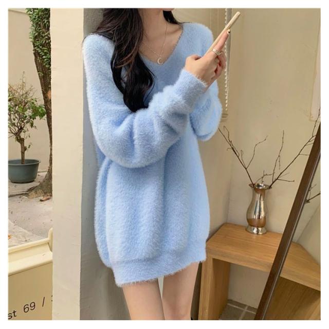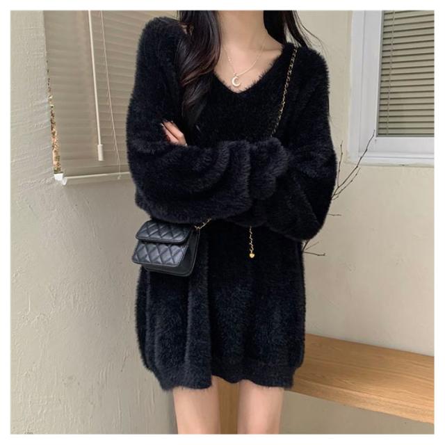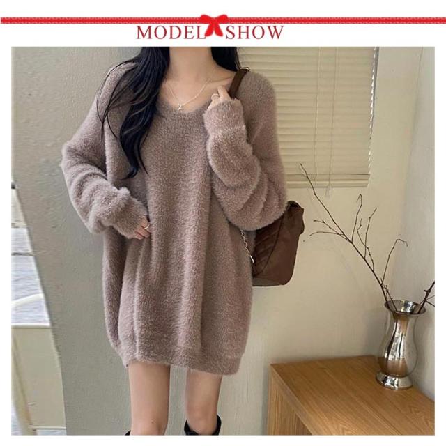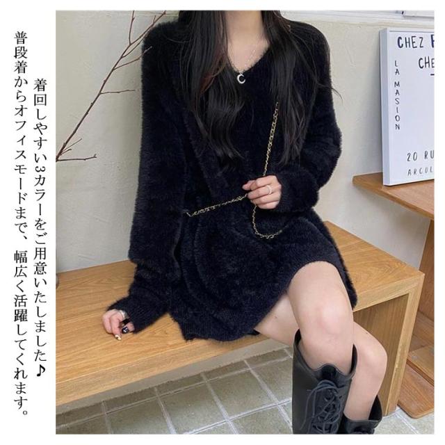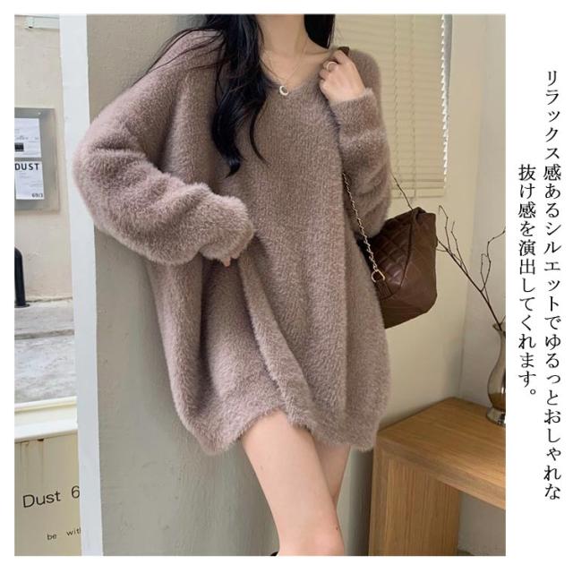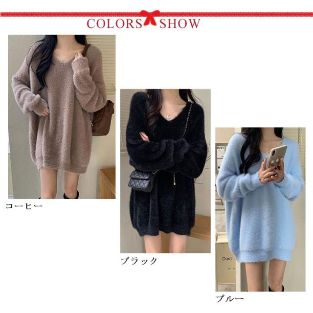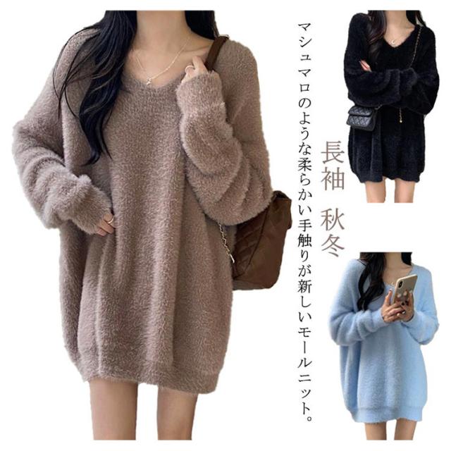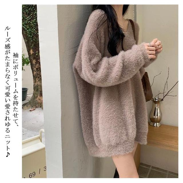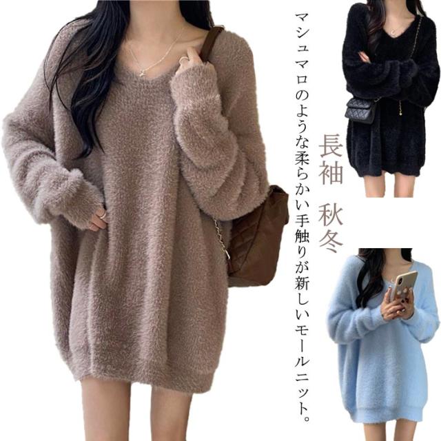 送料無料 ふわふわ ニット セーター チュニック トップス レディース プルオーバー Vネック かわいい 長袖 ゆる ボリューム 袖 セクシー スッキリ ゆったり ふんわり 厚手 シンプル 無地 可愛い 通学 通勤 秋冬 大人 大人ギャル