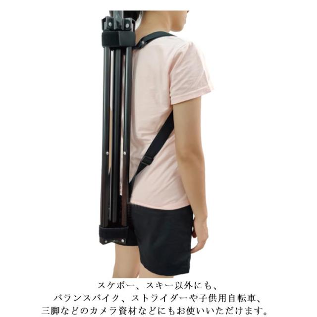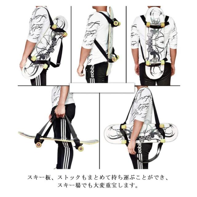 | スケートボードをリュックのように背負える移動や、保管等に最適なキャリーストラップ。 マジックテープで前後を留めるだけで簡単に背負えることができ、ワンショルダーにも、クロスボディにも長さ調節ができます。 スキー板、ストックもまとめて持ち運ぶことができ、スキー場でも大変重宝します。 スケボー、スキー以外にも、バランスバイク、ストライダーや子供用自転車、三脚などのカメラ資材などにもお使いいただけます。 通勤や通学などの移動時にも小さく折りたたむことができ、荷物になりません。 | |
