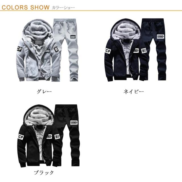 | 暖か超裏起毛モコモコセットアップです! 裏起毛はふんわりとした肌触りで、毎日着たくなるほどのぬくぬく快適な着心地です。 秋冬の寒い時期の防寒具として暖かい長袖ジップアップアウターとロング丈スエットパンツのセットです。 普段使いは勿論、部屋着やスポーツなど、様々なシーンで活躍します。 旦那様・彼氏さんへのプレゼントとしてもおススメです。 | |