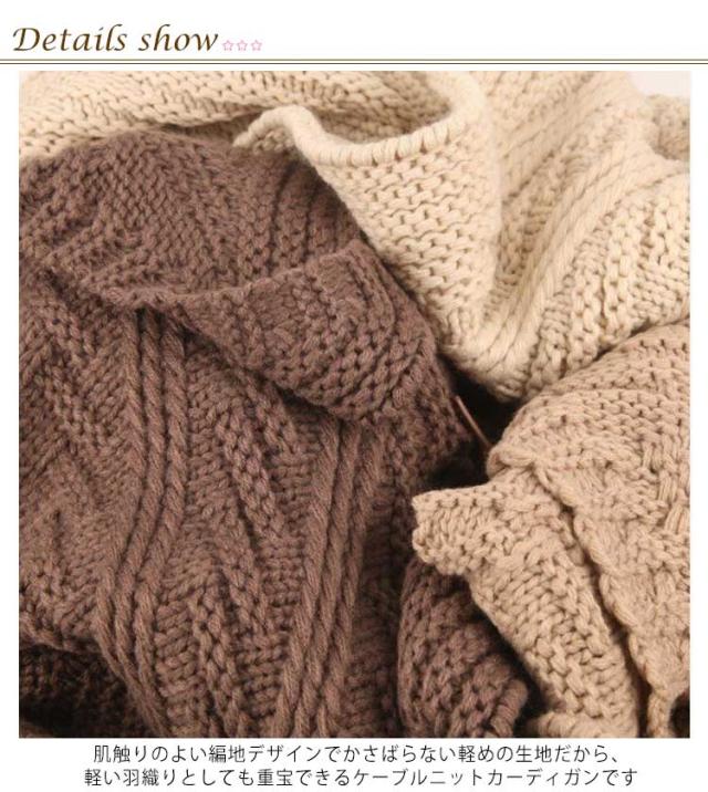 | 着られるケーブルニットカーディガン 肌触りのよい編地デザインでかさばらない軽めの生地だから、軽い羽織りとしても重宝できるケーブルニットカーディガンです コーディネートに取り入れるだけでカンタンに旬の装い。 かぽっと頭から被るだけでいつものお洋服が可愛い印象にチェンジ♪ スッキリみえるショート丈!ゆったりとしたシルエットが自慢です。 シンプルなカットソーやシャツなど、合わせるお洋服によってもイメージが変わりますので、いろいろな着こなしを楽しんでみてくださいね。 | |
