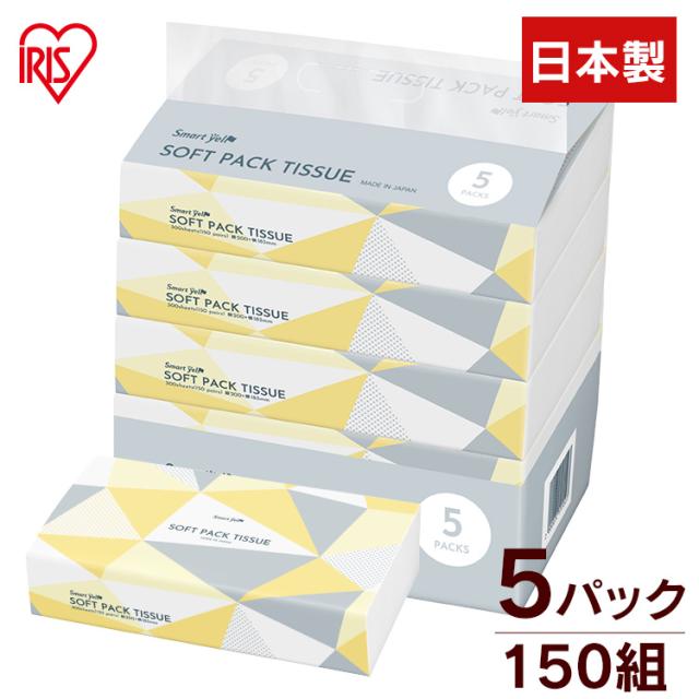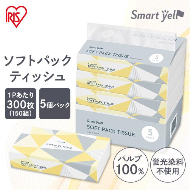ティッシュ ティッシュペーパー ソフトパック 国産 ソフトパックティッシュ 300枚(150組) 5個 ティッシュペーパー ソフトパックティッシュ コンパクト 省スペース パルプ100% 蛍光染料不使用 スマートエール 国産 送料無料