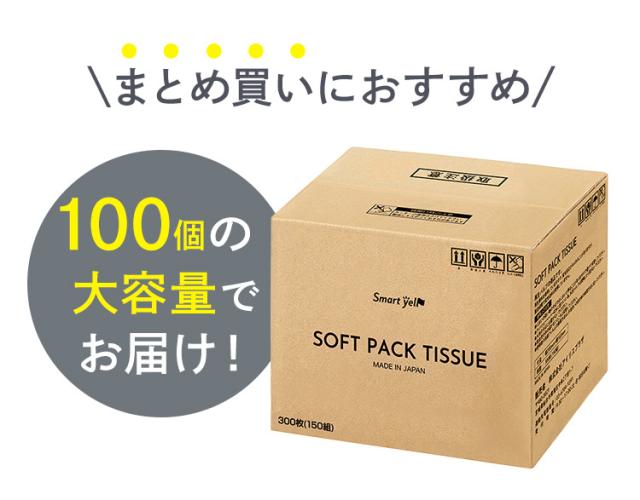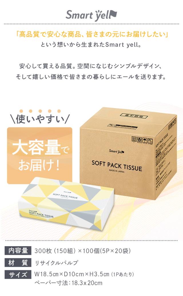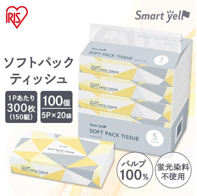 ティッシュ ティッシュペーパー ソフトパック 国産 ソフトパックティッシュ 300枚(150組)5P×20 100個 ティッシュペーパー ソフトパックティッシュ コンパクト パルプ100% 蛍光染料不使用 まとめ買い 大容量 スマートエール 送料無料