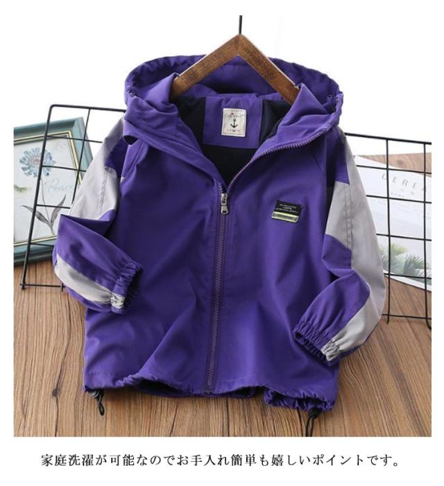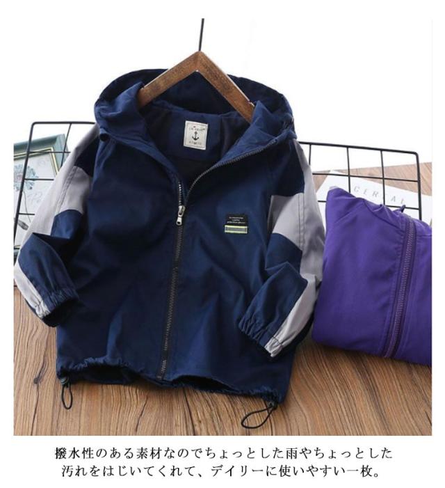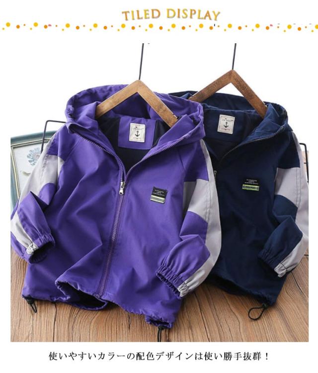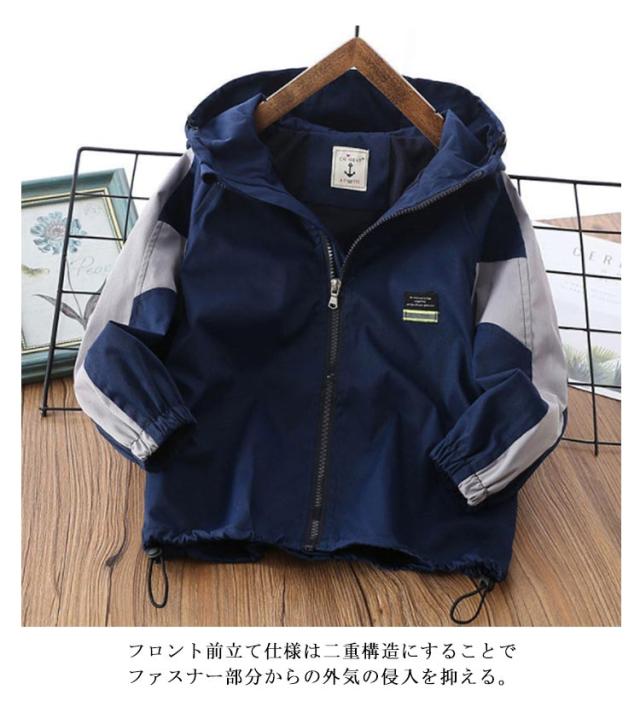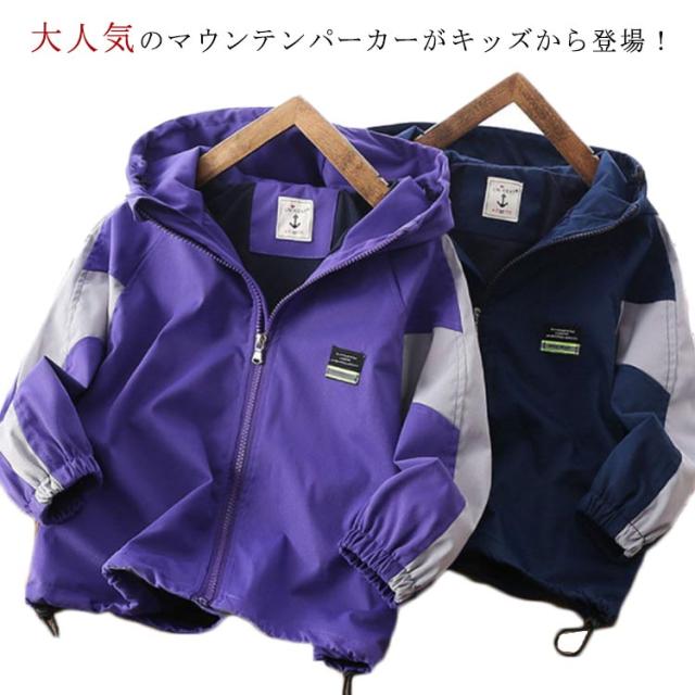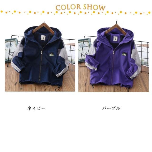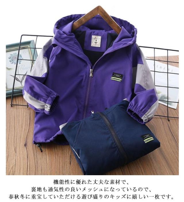 キッズ アウター マウンテンパーカー 子供服 ウインドブレーカー 配色 防風 撥水 男の子 通学 裏メッシュ フード付き ジップアップパーカー 薄手 ゆったり 春秋冬 無地 110 120 130 140 150 160 170 ネイビー 紺 【送料無料】