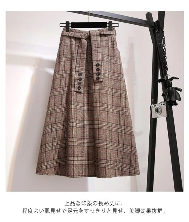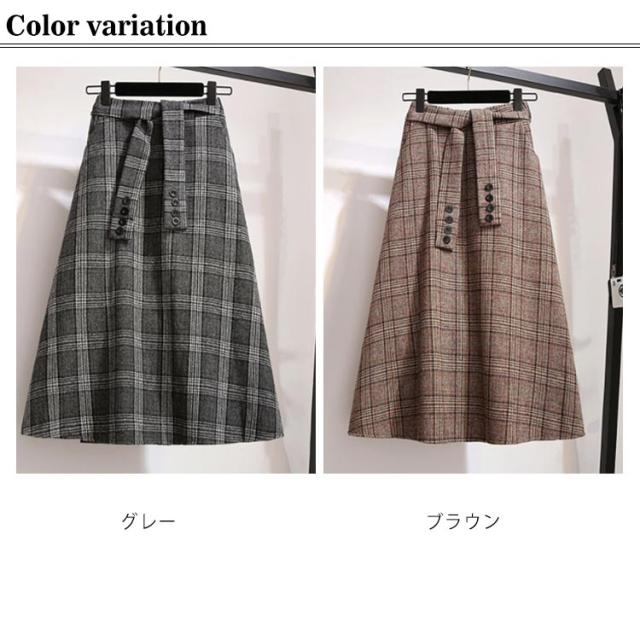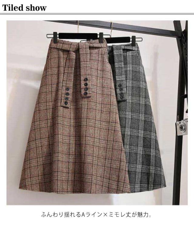 スカート 秋冬 チェック柄スカート Aラインスカート グレンチェック ロングスカート フレアスカート ウエストベルト付き 膝下丈
