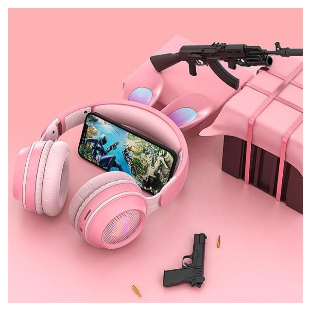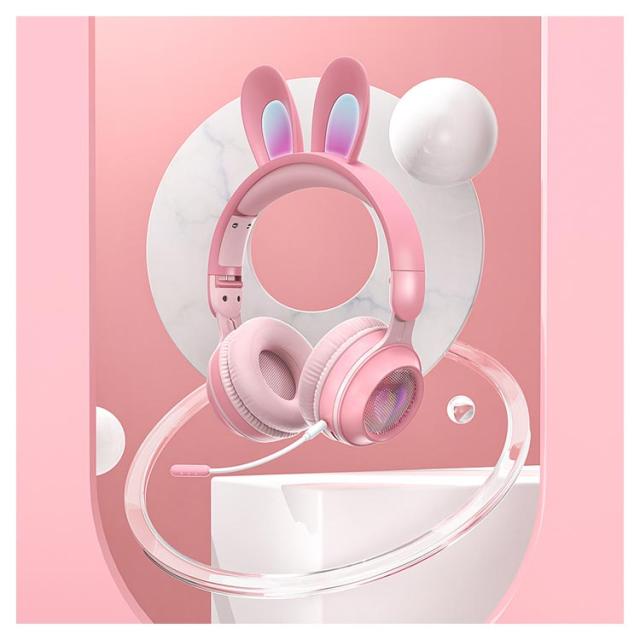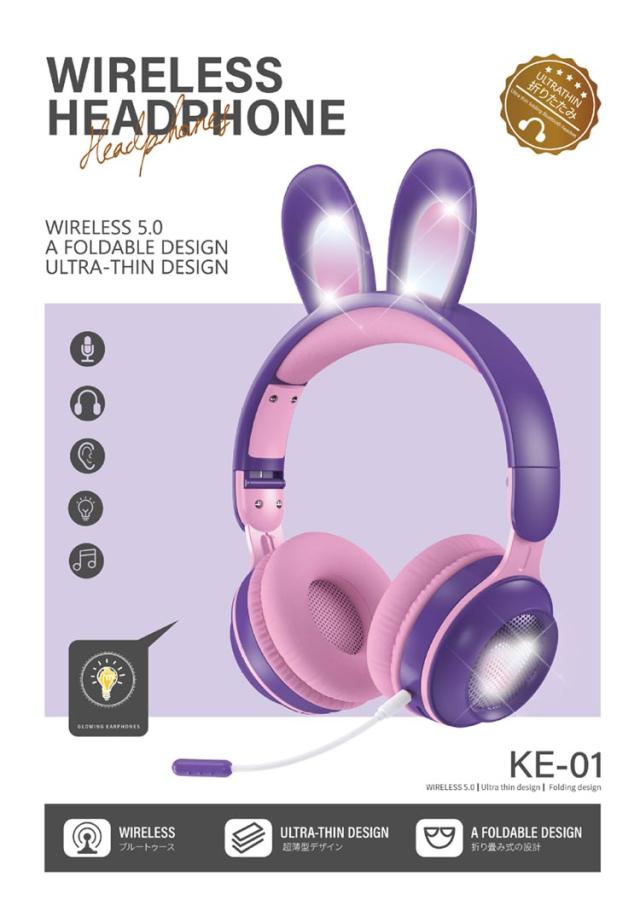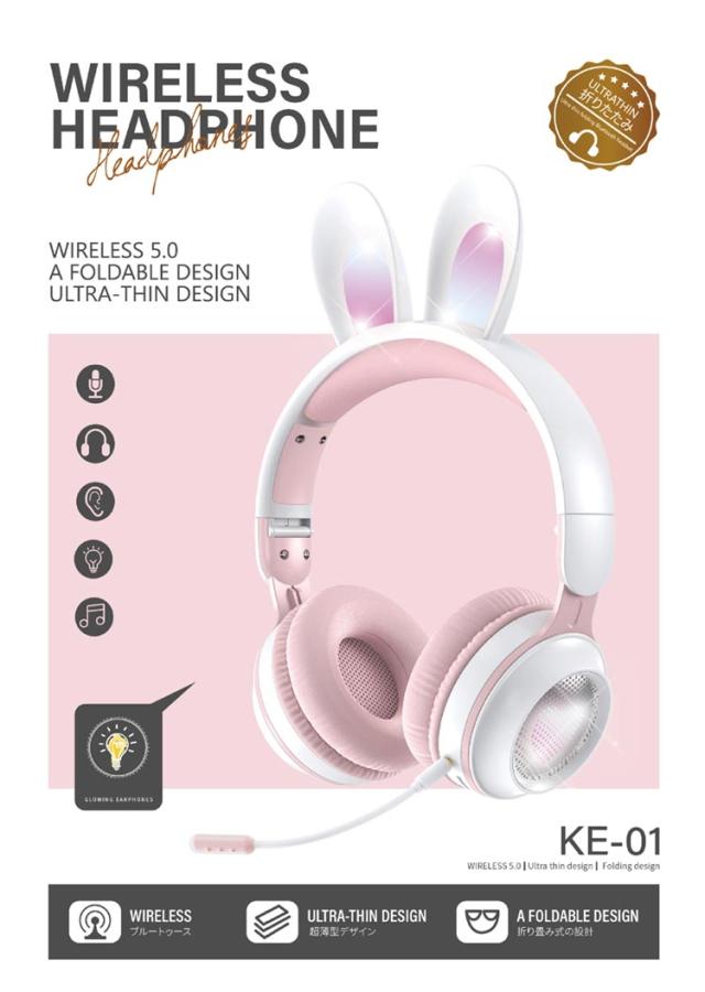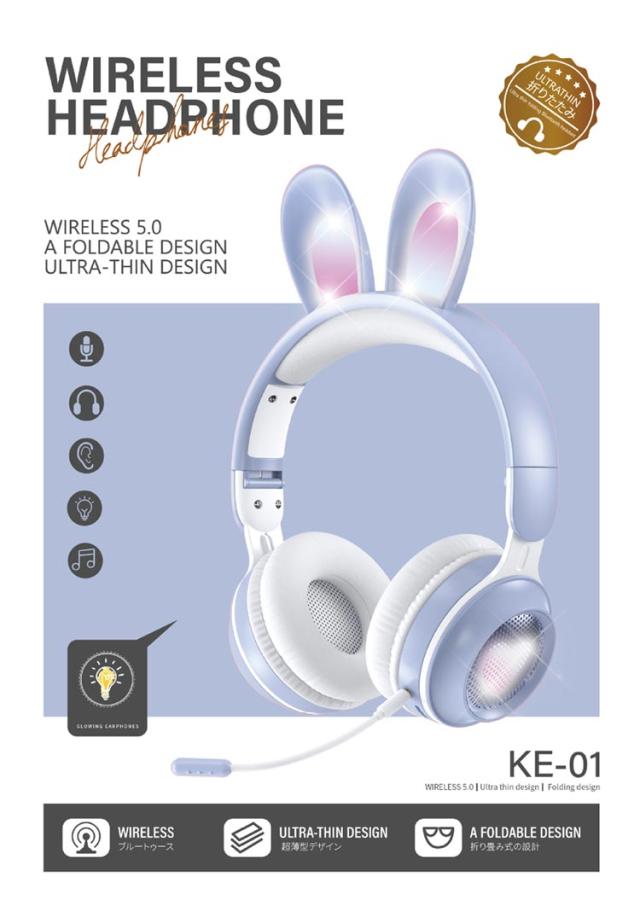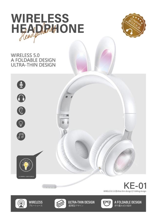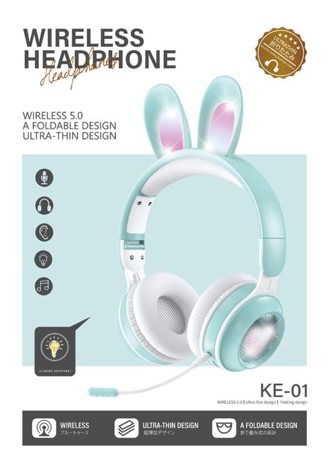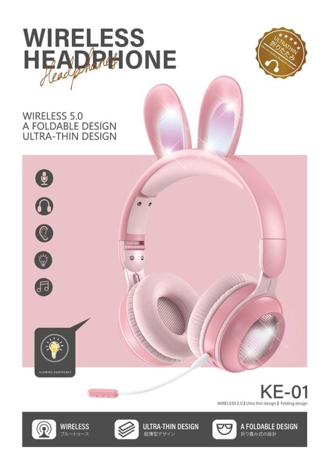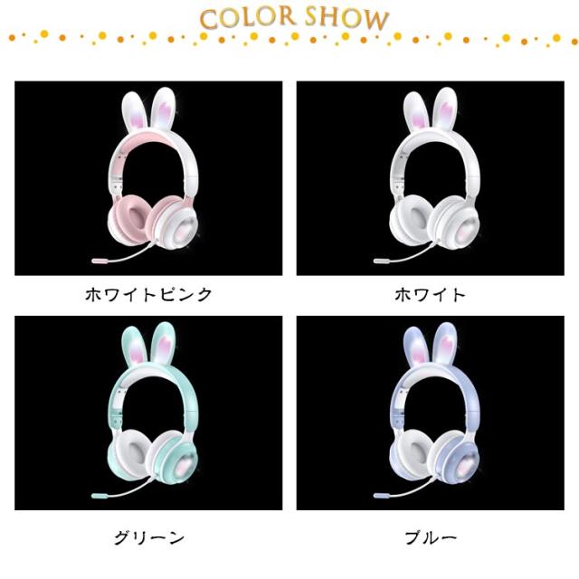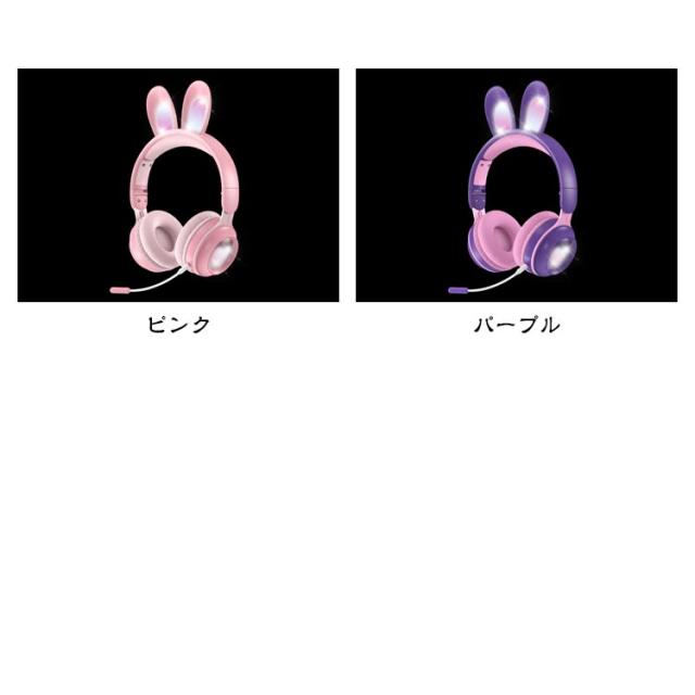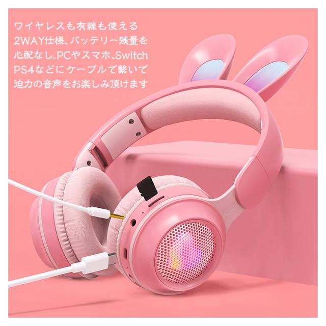 | 可愛いうさ耳ヘッドフォンが新登場。 音楽を楽しんでいる間に、光るカラフルなLEDライトが身につけてもファッション感と可愛さをUPします! ワイヤレスも有線も使える2WAY仕様、バッテリー残量を心配なし。PCやスマホ、Switch、PS4などにケーブルで繋いで迫力の音声をお楽しみ頂けます。 Bluetooth5.0を搭載し、より低遅延、ストレスなく安定した接続が実現。 マイクはお好きな角度に調節でき、しっかり声が拾い、語学勉強などに大活躍。 | |