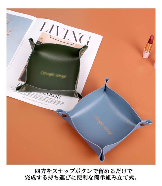 | オシャレで便利な小物マルチトレイができました。 アクセサリーや鍵などなくしやすい小物のロケーションに。 拭き取り可能なPUレザーなので水分のある洗面所などでも安心してお使い頂けます。 スナップボタンを外せば完全にフラットに。使わない時は、重ねて収納できるので、かさばりません。 カバンに入れて持ち運びも便利なので、旅行先でも大活躍。 シンプルなデザインとおしゃれな色合いが幅広いお部屋にマッチし、ご自宅用はもちろん、プレゼントにもおすすめです! | |