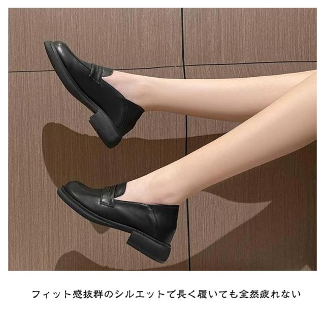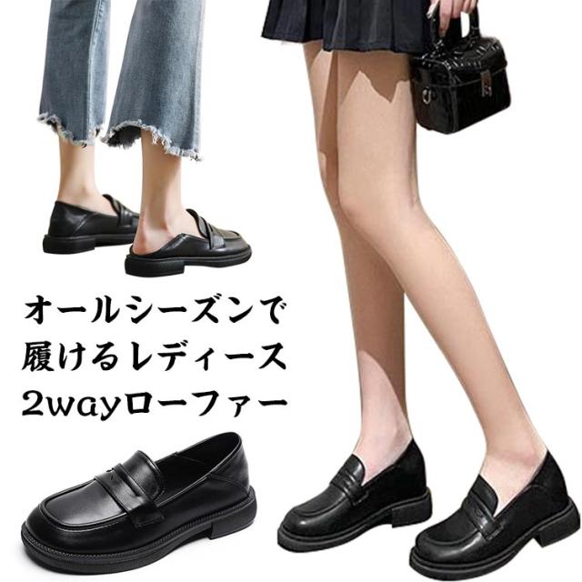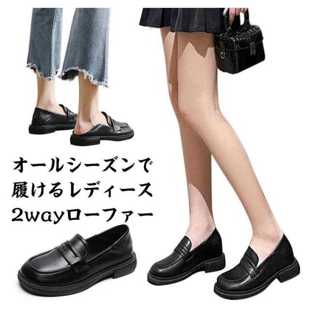 ラウンドトゥ レディース 厚底 レディース 厚底ローファー ローファー フラットシューズ スクエアトゥ PUシューズ ローファー プラットフォーム マニッシュ ヒール3.5cm 黒 ブラック レトロ 楽チン 靴 2way