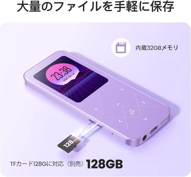 MP3音楽プレーヤーは32GBの大容量を提供し、最大128GBのTFカード拡張をサポートします (TFカードは含まれない)。