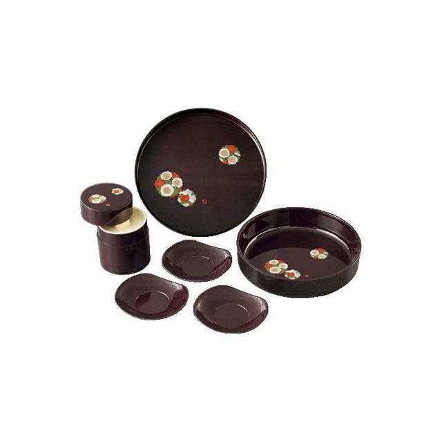 ABS樹脂紀州塗り 茶の間Cセット 花丸春秋 成願義夫 菓子鉢 丸盆 茶托 茶筒 おしゃれ シンプル 来客 お菓子入れ トレー 和菓子 日本製 国産