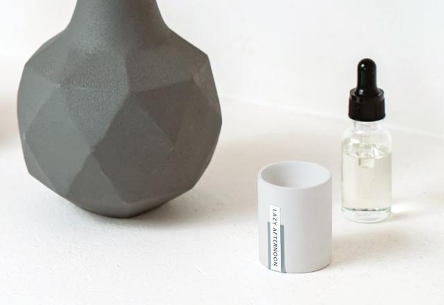 石膏のアロマストーンはシンプルながら滑らかで美しい印象に。付属のオイルは扱いやすいスポイトタイプを採用しています。 |