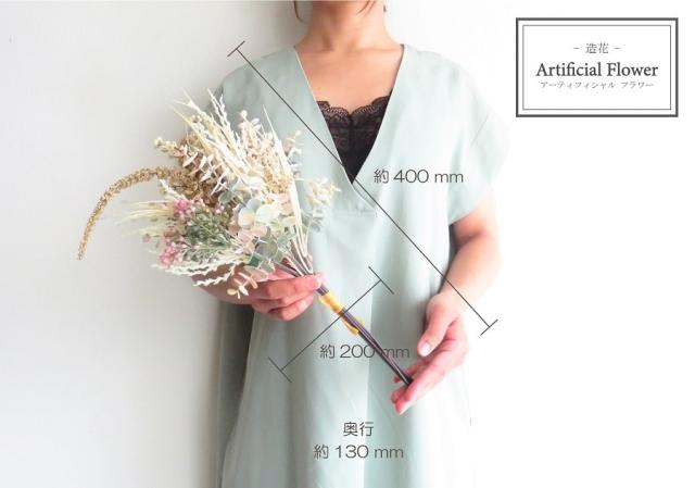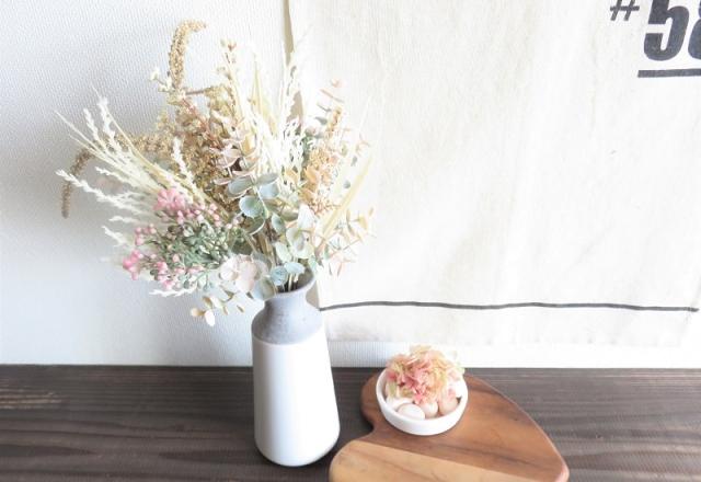 パステル調の優しいカラーバランス、ナチュラルアンティーク感が魅力。指し色のほのかなグリーンとピンクも印象的なブーケ。そのまま飾れて水やりの必要もないので気軽に楽しめる。ただ飾る以外にも形を変えてオリジナルリメイクするのも楽しい。