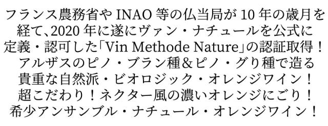 フランス農務省やINAO等の仏当局が10年の歳月を経て、2020年に遂にヴァン・ナチュールを公式に定義・認可した「Vin Methode Nature」の認証取得!アルザスのピノ・ブラン種&ピノ・グり種で造る貴重な自然派・ビオロジック・オレンジワイン!超こだわり!ネクター風の濃いオレンジにごり!希少アンサンブル・ナチュール・オレンジワイン!