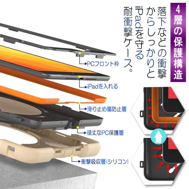 ハードPC+ソフトシリコン、PC素材の採用で、タブレッドの四隅を完璧に保護の上、手触り感が良く、落下防止などの衝撃からしっかりとiPadを守る耐衝撃ケースです。