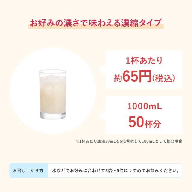 水などでお好みに合わせて3倍〜5倍にうすめてお飲みください。