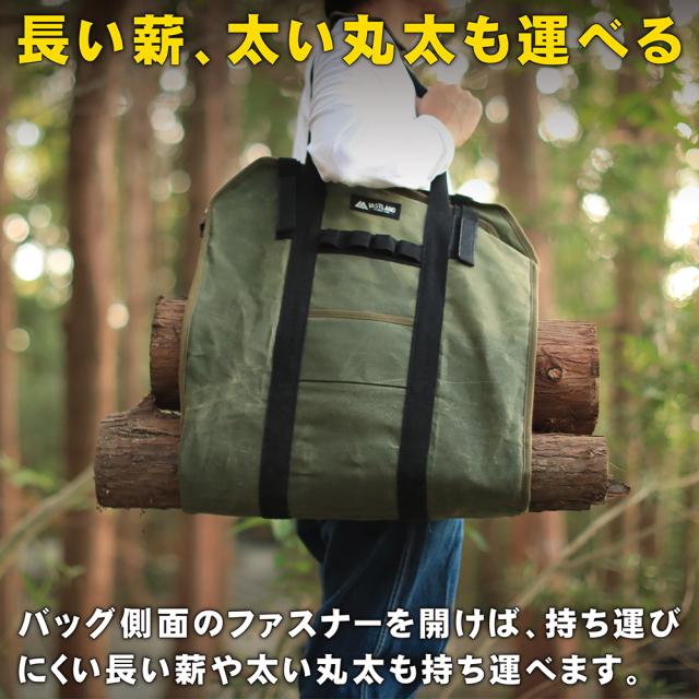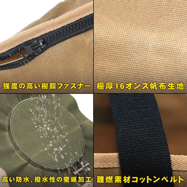 【長い薪・太い丸太も運搬可能】側面のファスナーを開いて開放することで、長い薪や太い丸太も運搬できます【タフに使える】1、強度の高い樹脂ファスナー 2、極厚の16オンス帆布生地 3、高い防水、撥水性の蜜蝋加工 4、難燃素材のコットンベルトを採用