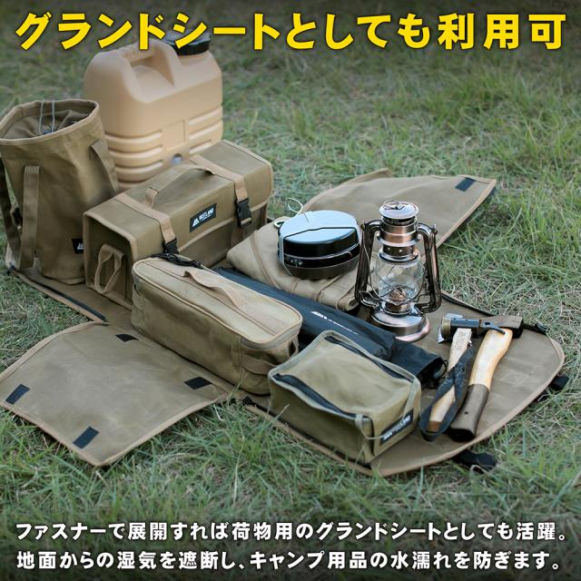 【グランドシートとしても利用可能】側面のファスナーを開き平らな状態にすることで、荷物用のグランドシートとしても活躍します。地面からの湿気を遮断し、キャンプ用品の水濡れを防ぎます。