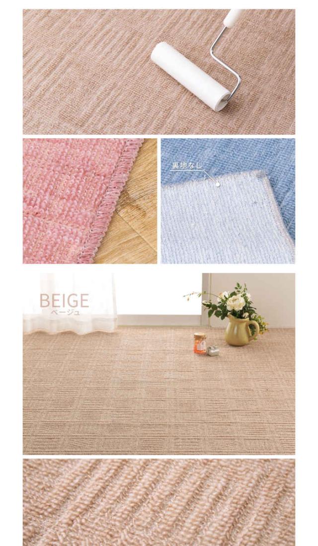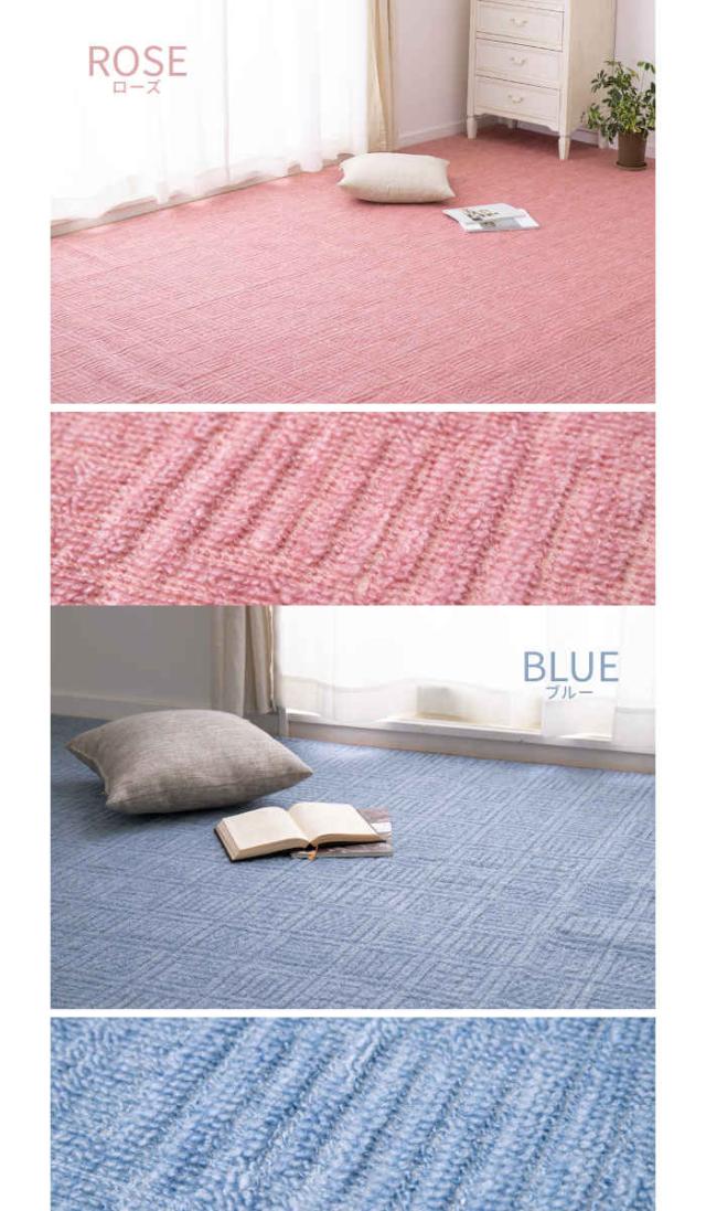 扱いやすい軽量の平織カーペット。本間6畳 286×382cm。カラーは、ベージュ(4955872844046/600200560)、ローズ(4955872844091/600200660)、ブルー(4955872909141/600017260)です。一人暮らしでも持ち運び簡単。弾力があり復元性に優れていてへたりにくく、ふかふかとした肌触りが特徴です。