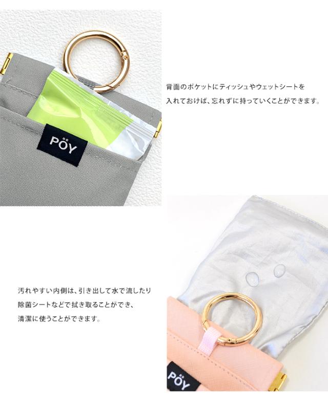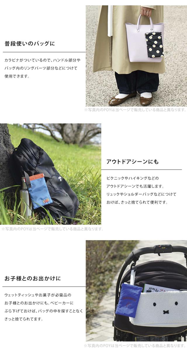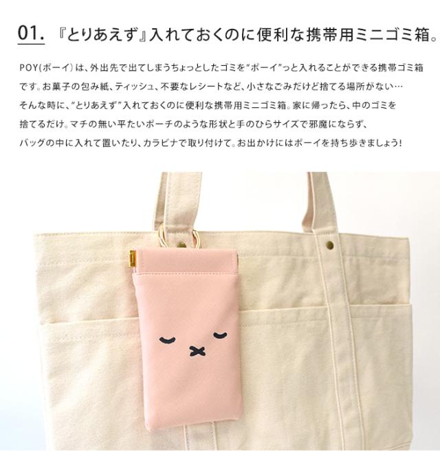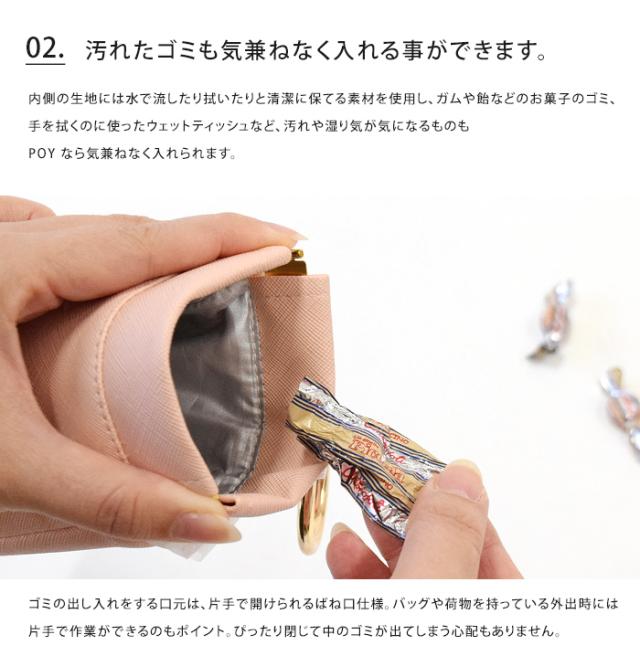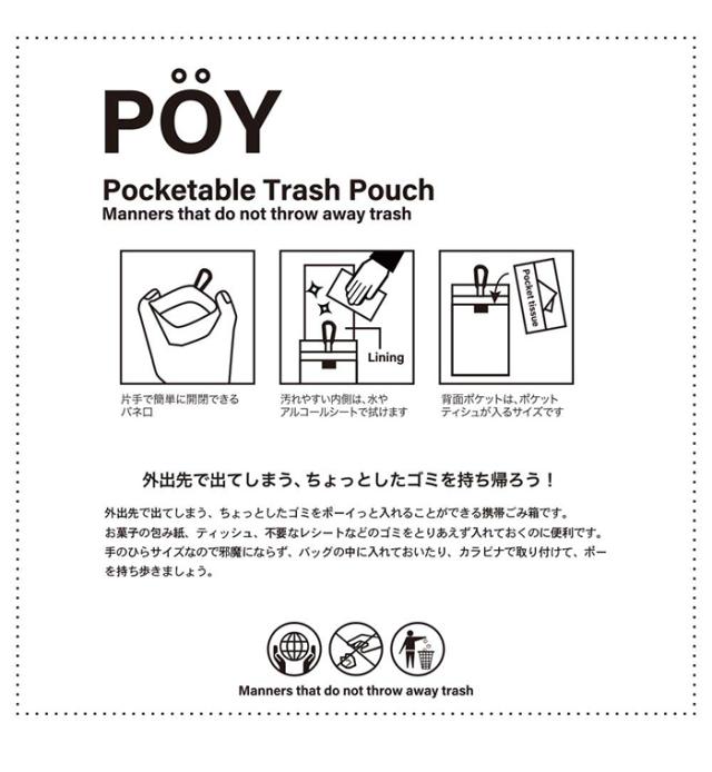 POY(ポーイ)は、外出先で出てしまうちょっとしたゴミを"ポーイ"っと入れることができる携帯ゴミ箱です。お菓子の包み紙、ティッシュ、不要なレシートなど、小さなごみだけど捨てる場所がない…そんな時に、"とりあえず"入れておくのに便利な携帯用ミニゴミ箱。家に帰ったら、中のゴミを捨てるだけ。マチの無い平たいポーチのような形状と手のひらサイズで邪魔にならず、バッグの中に入れて置いたり、カラビナで取り付けて。お出かけにはポーイを持ち歩きましょう。内側の生地には水で流したり拭いたりと清潔に保てる素材を使用し、ガムや飴などのお菓子のゴミ、手を拭くのに使ったウェットティッシュなど、汚れや湿り気が気になるものもPOYなら気兼ねなく入れられます。