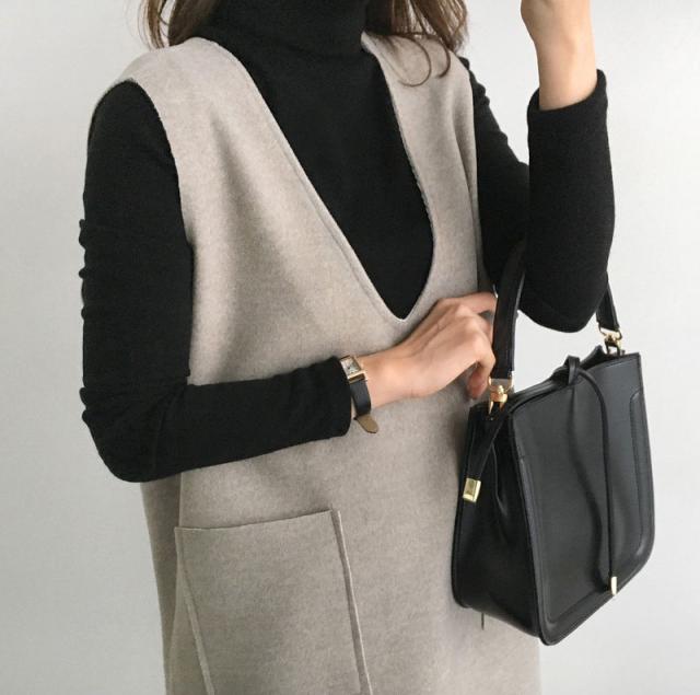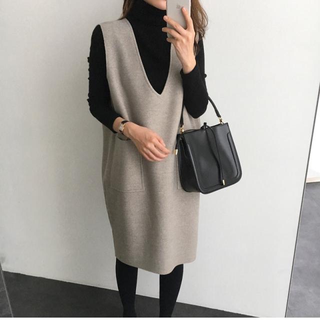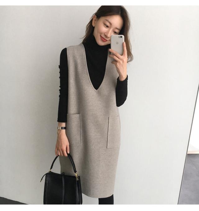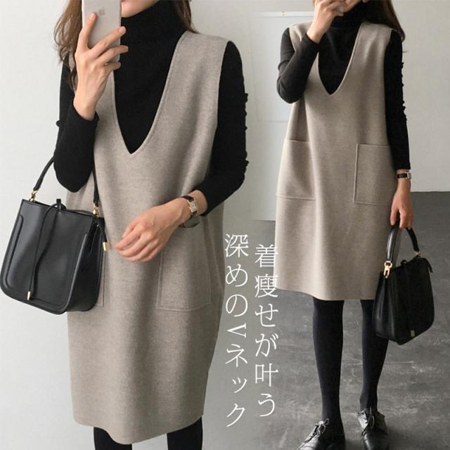 ジャンパースカート ノースリーブワンピース Vネック ジャンスカ 無地 重ね着 膝丈 レディース 春秋冬 体型カバー ストレートシ