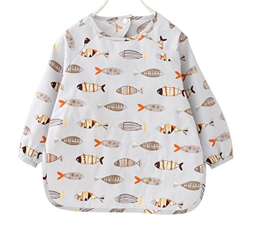 キッズ 長袖 防水 食事用エプロン スモック (グレー魚, 90#(80-90cm))
