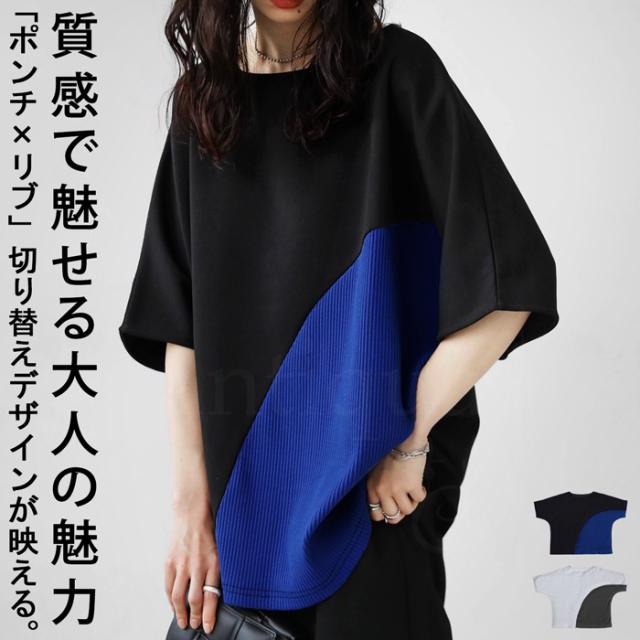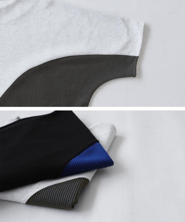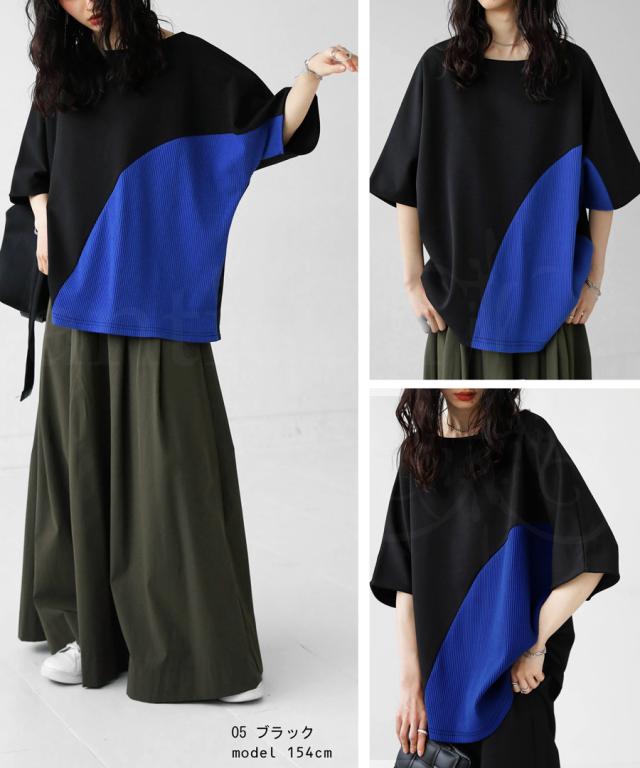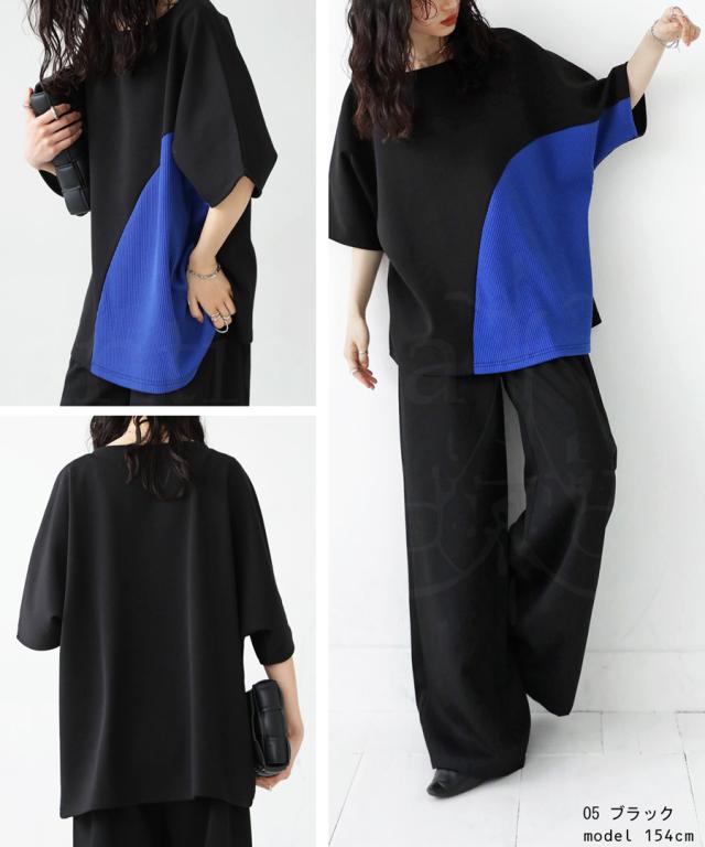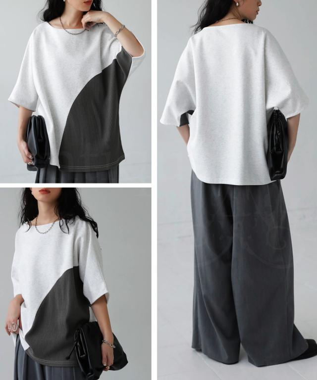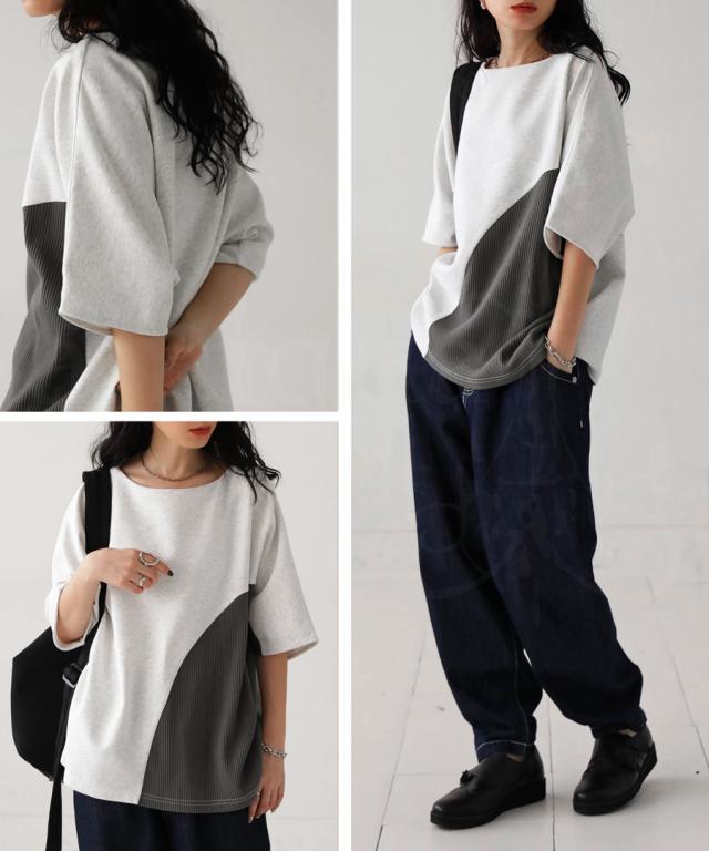 pn-00381 カットソー 半袖 五分袖 無地 配色 異素材 切り替え リブ ポンチ素材 ドルマン ドルマントップス ゆったり ボートネック 綿混 厚手 見返し襟 モード オーバーサイズ