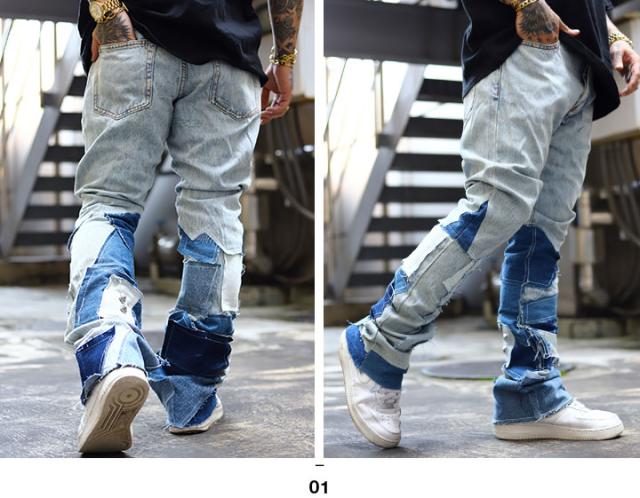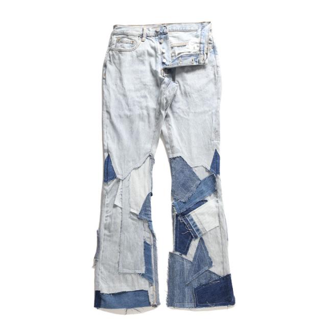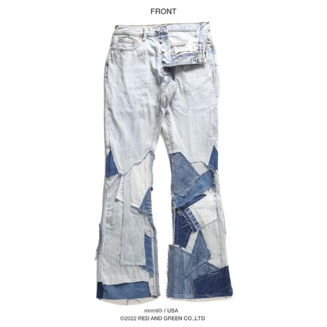 mnml デニム ジーンズ フレアパンツ メンズ 青 大きいサイズ ミニマル ジーパン Gパン パンツ スリム 細身 おしゃれ 無地 ベルボトム フレア パッチワーク 継ぎ接ぎ スタッズ b系 ヒップホップ ファッション ストリート系 ハイ ブランド 22ML-FW387D