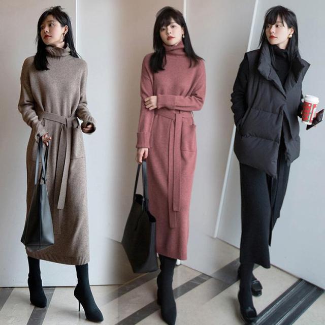 ニットワンピース レディース 40代 秋冬 長袖ワンピース ニットロングスカート ハイネックワンピース ひざ下 無地セーター ゆったり 韓国風 オシャレ