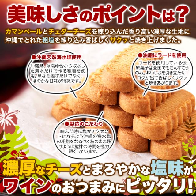 カマンベールとチェダーチーズを練り込んだ香り高い濃厚な生地に沖縄でとれた粗塩を練り込み香ばしくサクッと焼き上げました。