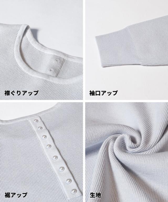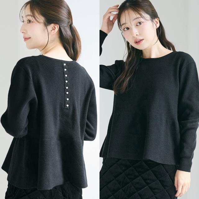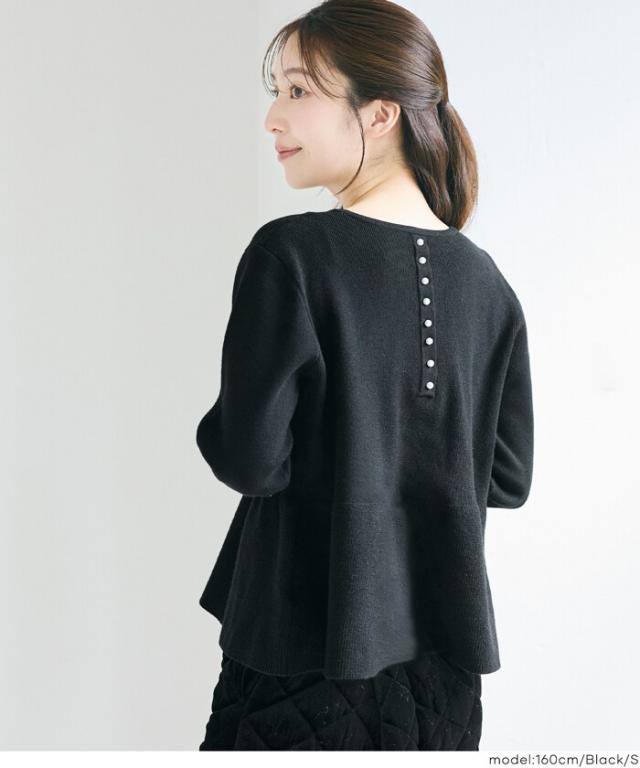 バックスタイルにさりげない華やかさを添える、パール付きフレアニットトップス