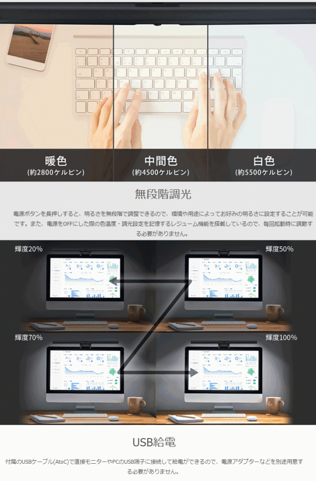 約210万画素。フルHD。30fps。USB2.0。ライト色温度 暖色:約2800K 中間色:約4500K 白色:約5500K。