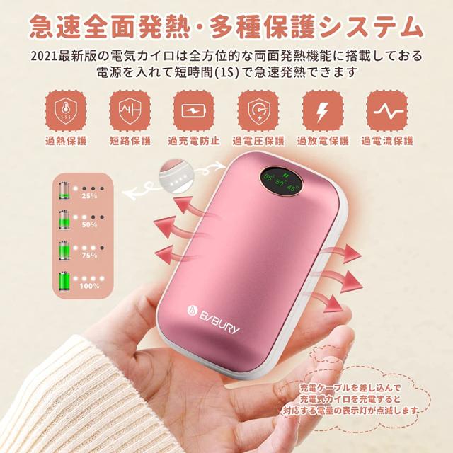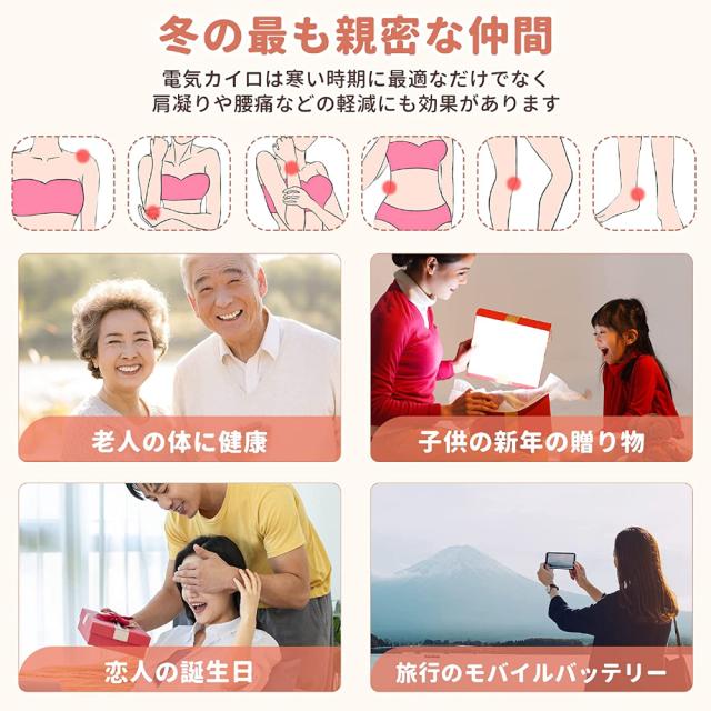 【安全性へのこだわり電熱カイロ】充電する時も安心して使えるための6つの安全装置搭載。PSE認証済の安全充電設置で、過充電防止、過熱保護、短路保護、過電圧保護、過放電保護、過放電保護機能を搭載しています。また、充電が完了すると自働的に電源が切れるので、安心してお使いいただけます。充電カイロは、通常の使い捨てカイロとは異なり、ゴミが出ないと同時に常時購入する必要もなく、繰り返して長期間使えるので環境にとても優しくて経済的な充電カイロです。