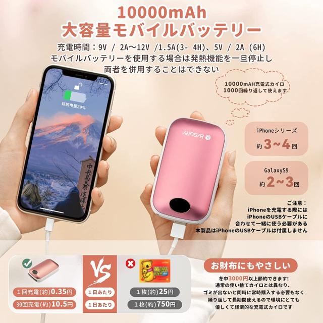 【充電式カイロ 薄型&10000mAh 大容量 モバイルバッテリー】ホッカイロは最新版で10000mAHの電池容量を搭載しております。環境温度は20℃の場合、カイロとして低温モードが14時間 、中温モードが8時間、高温モードが6時間に連続発熱できます。モバイルバッテリーの機能も搭載しています。USBケーブルを使ってカイロを充電する時、9V / 2A〜12V /1.5Aで3時間、5V / 2Aで6時間以内に電力を満タンにすることができる。USBでスマホを充電する場合は、iPhoneシリーズが約3〜4回に使いことができる、GalaxyS9が約2〜3回に使い続けることができます。充電して1000回繰り返して使えます。特にスマートフォンが手放せない時代にスマホと接続するだけで充電が可能です。寒い時期に使っただけでなく、オールシーズンで活用することができます。