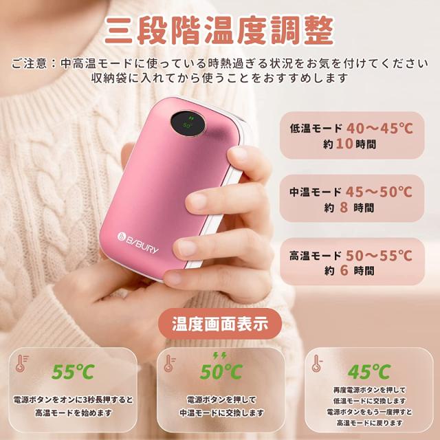 【3段階温度設定・1S両面急速発熱】カイロ充電式は全方位的な両面発熱機能に搭載しております。電源を入れて短時間(1S)で急速発熱できます。温度調節機能を搭載してので、3つのモードは低温モード40〜45℃ 、中温モード45〜50℃、高温モード50〜55℃があります。使用する時周囲の環境や自身の好みに合わせて調節できます。寒い時期は手のひらだけでなく、肩や腰などにどこでもいつでも気軽に使えます。