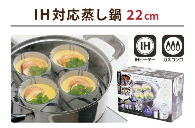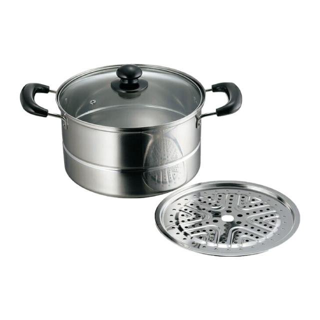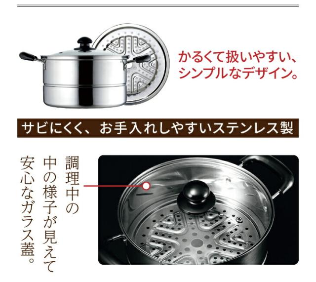 鍋 両手鍋 蒸し鍋 深型 IH対応 直火 ステンレス製 ガラス蓋 蒸し料理 スチームポット 蒸し器 スチーマー 22cm 送料無料