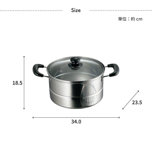●素材/本体:18-0ステンレス鋼(底の厚さ:0.5mm)、目皿:18-0ステンレス鋼、取っ手・つまみ:フェノール樹脂、フタ:全面物理強化ガラス