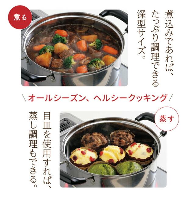 ●仕様/IH対応(100V・200V)、ガスコンロ対応、適正容量:蒸す:1.2L、煮る:3.5L