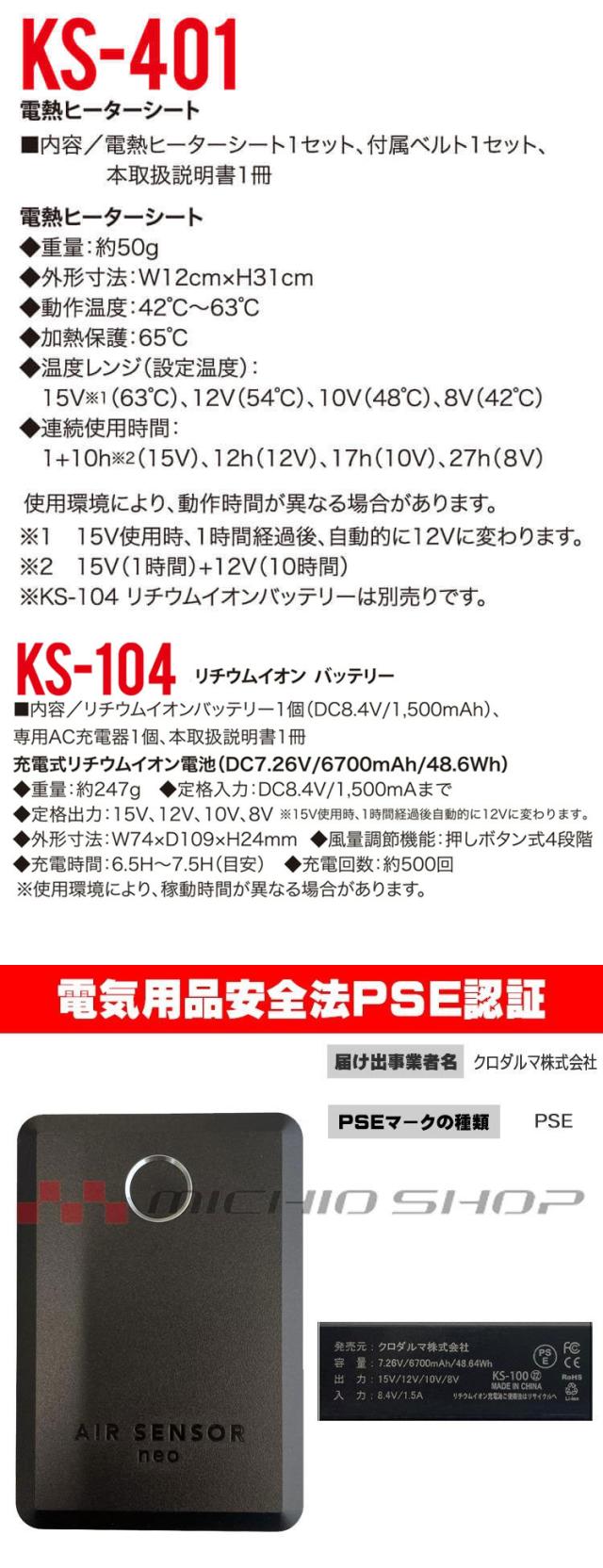 ・セット内容 :服、電熱ヒーターシート(KS-401)、リチウムイオンバッテリー(KS-104)、ACアダプター充電器(KS-106)