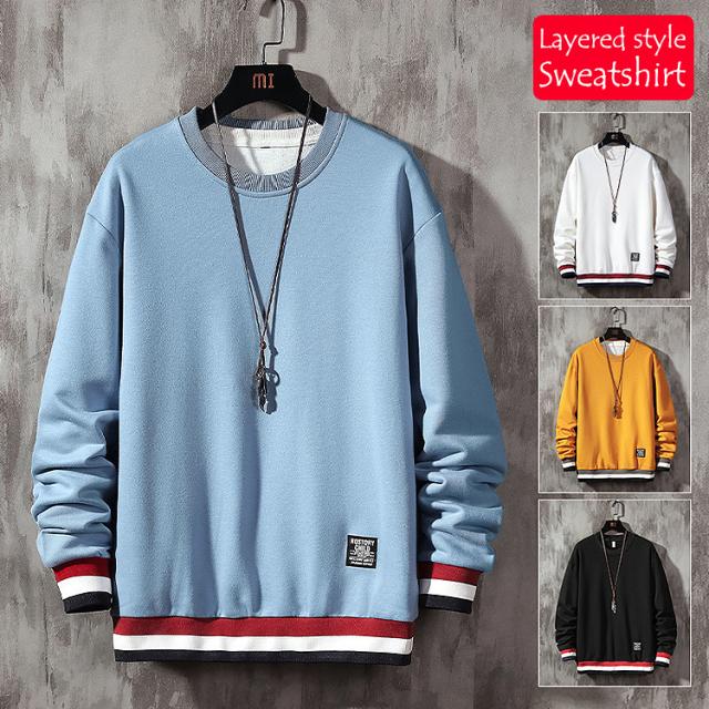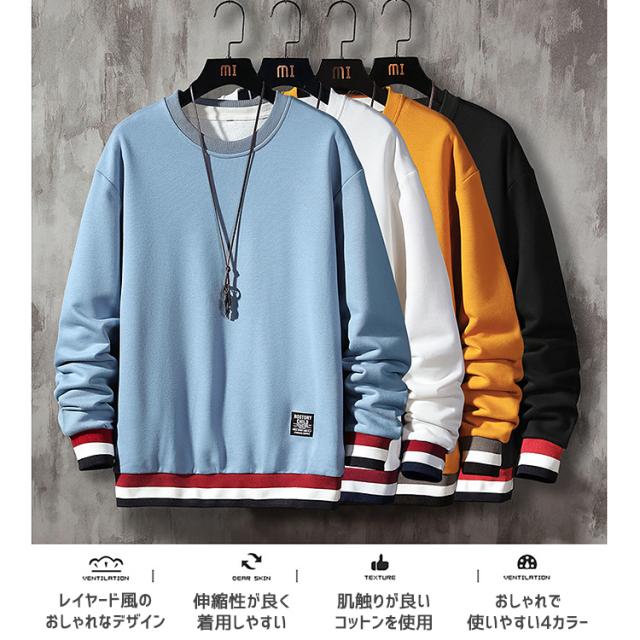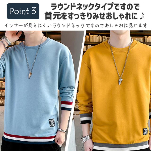 トレーナー メンズ スウェット 秋 冬 トップス おしゃれ かわいい レイヤード プルオーバー レイヤード風 重ね着風 ライン入り 長袖 tシャツ 無地 ロゴ クルーネック カジュアル ブラック ホワイト ブルー イエロー