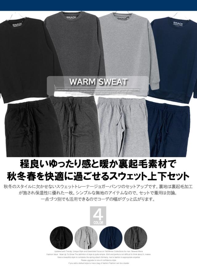 | 説明 | あったか裏起毛素材の無地スウェットトレーナーとスウェットパンツの上下セットアップです。 着心地は快適ですっきりとしたシルエットで合わせやすい一枚です。 普段着としてはもちろん、スポーツシーンにも大活躍してくれます。 トレーナー、スウェットパンツともに定番の使いやすいかたちなので、セットアップでも、上下バラバラでも使え着こなしの幅を広げてくれるアイテムです。 上下セットなので部屋着にもピッタリです。 |
