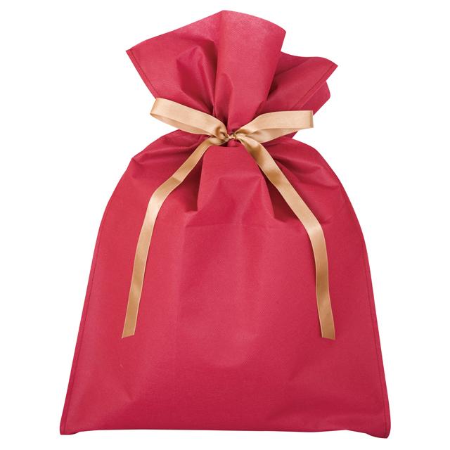 リボン付きでエンジ色の不織布巾着バッグです。無地でカラーバリエーションがあるので高級やナチュラルテイストなどお店のイメージに合わせてお使いいただけます。リボンがついていることで、入れて結ぶだけでラッピングが完成するので、クリスマス、母の日、父の日などの忙しいギフトシーズンにもおすすめの時短ラッピングアイテムです。